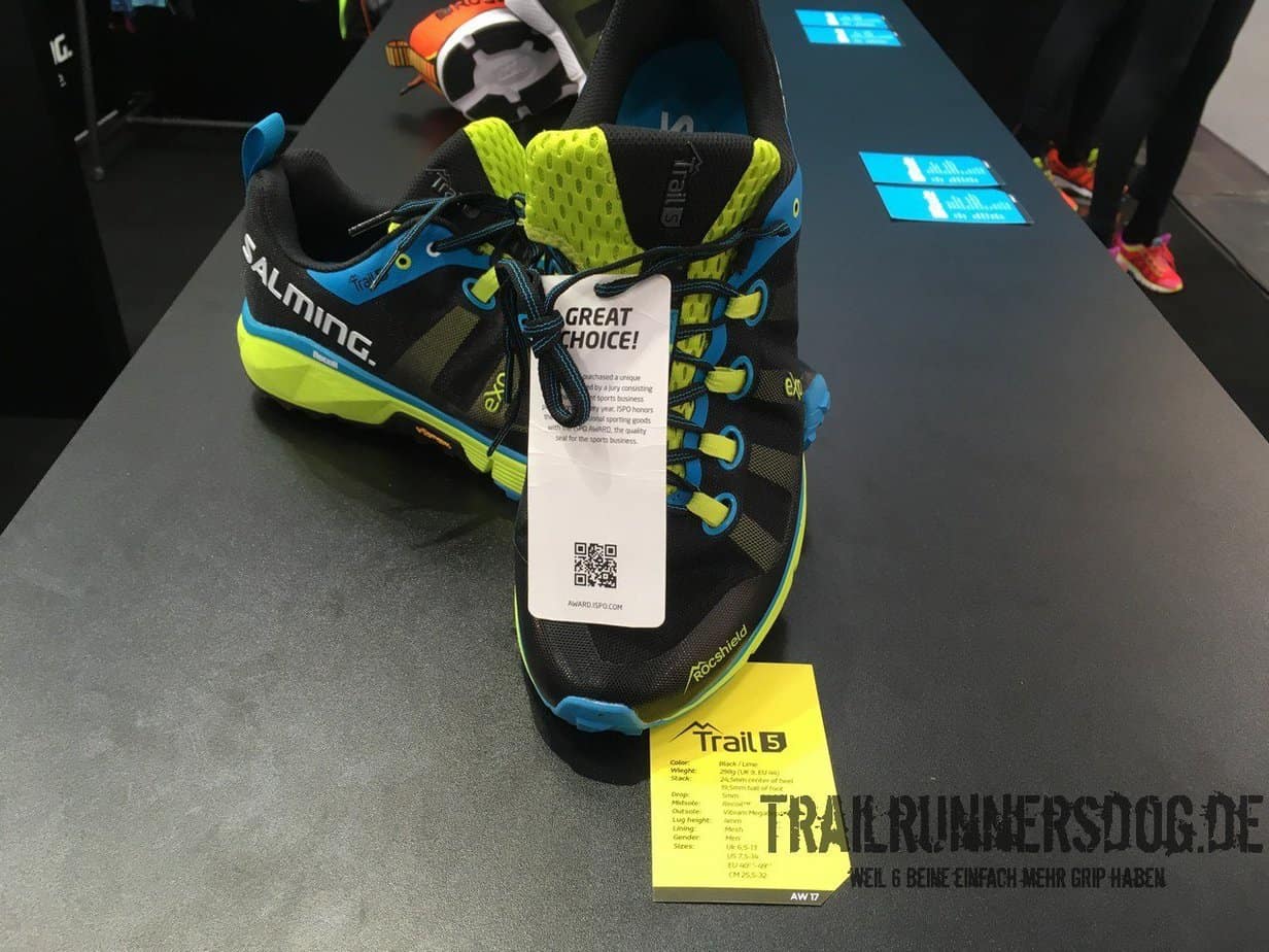Salming hat auf ISPO den neuen Trail 5 vorgeführt, er kommt wohl im Herbst / Winter 2017 auf den Markt. 298g in Gr. 44, 5 mm Drop und die Vibram MegaGrip Sohle. Wow sag ich da nur. Ich konnte mich selbst vor Ort vom Grip überzeugen als Antonio von Vibram mit dem Schuh auf eine nasse Steinplatte mit 40% Neigung stieg und einfach stehen blieb. Bei voller Auflage der Sohle rutschte er keinen Millimeter, trotz seiner (wie er sagte) 90 kg Körpergewicht, erst als er mehr oder weniger auf der Fußspitze stand, begann er zu rutschen. Dann wurde die Auflagefläche zu klein, bei normaler Belastung im Vorfußbereich hatte er noch guten Grip. Als der Schuh anfing zu rutschen, da war das allerdings kein ruckartige Rutschen, sondern der Schuh setze sich langsam in Bewegung. Das verspricht viel Sicherheit im Gelände und ich bin gespannt darauf den Schuh das erste Mal zu laufen. Der Trail 5 steht nämlich definitiv auf meiner „will haben“ Liste.