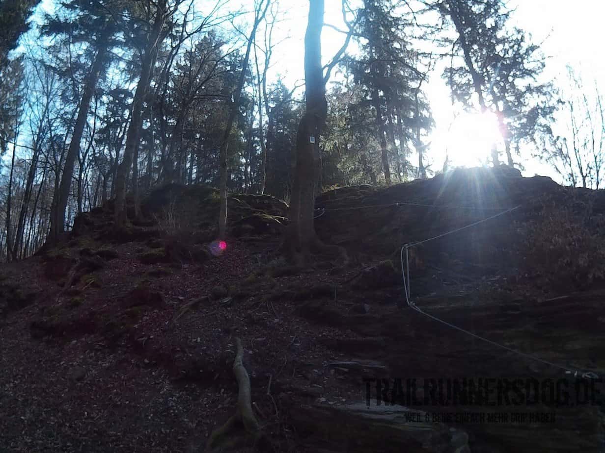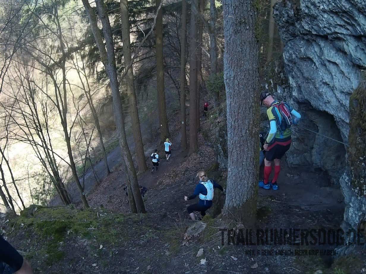 Kurz hinter Bell ging es dann auch schon in den Wald und relativ direkt in einen kleinen mit Seilen gesicherten Steig. Ich mag das ja total, solange es nicht erst bei km 70 auf mich wartet. Da die Langstrecke „nur“ 63 km lang sein wird, muss ich mich davor ja nicht fürchten. Torsten und ich scherzten noch ob man unterhalb des Steigs nicht einen VP und ein paar Sanitäter positionieren sollte, zur Sicherheit.