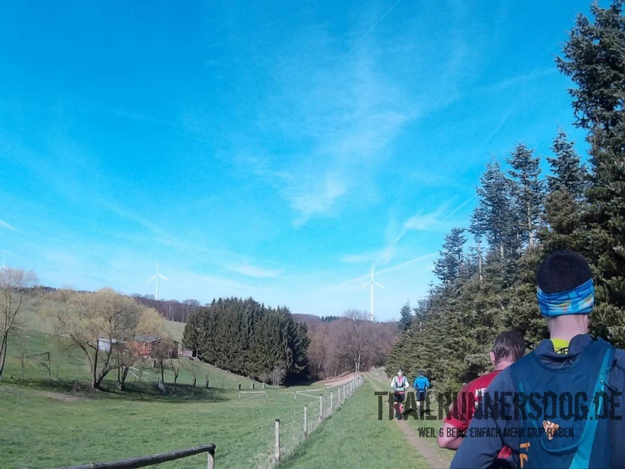 Kurz vor Mörz (im Hunsrück wohlgemerkt) hatten wir leider einen Ausfall zu verzeichnen, einer der Läufer deren Namen ich mir nicht gemerkt habe (das alte Leid…) knickte um und vertauchte sich das Sprunggelenk. Typischerweise auf einem recht einfachen Streckenabschnitt, kennen wir ja. Kaum muss man sich nicht mehr so konzentrieren, übersieht man einen Stein oder Ast. Gute Besserung an dieser Stelle!