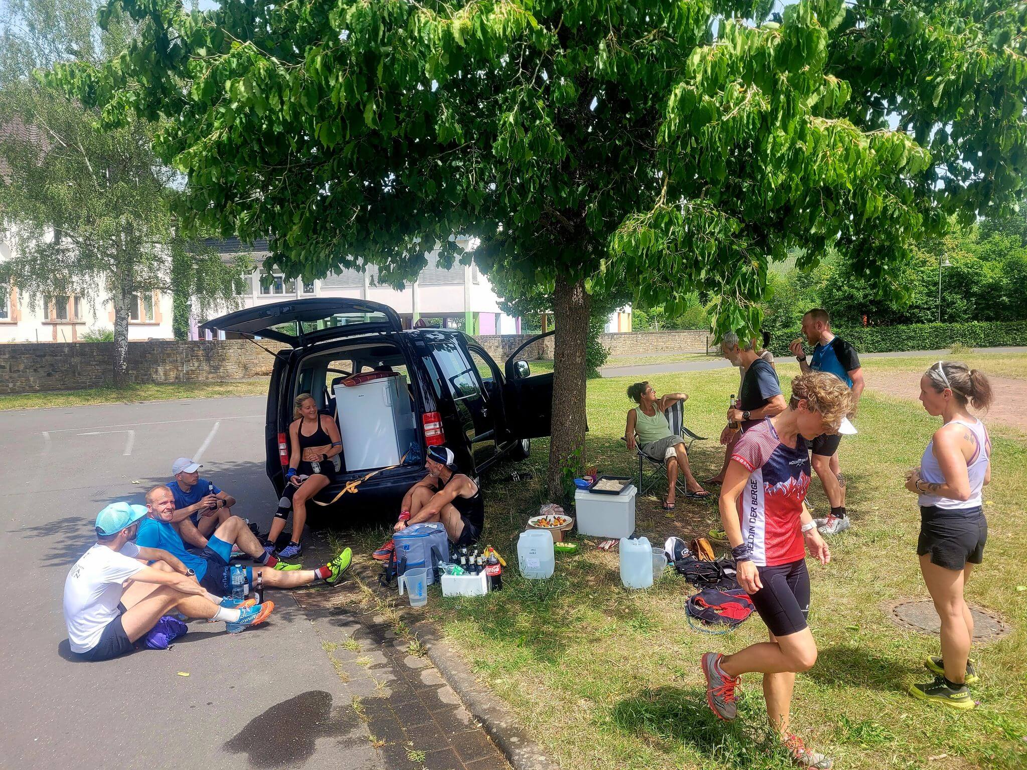 Ich habe nette und interessante Leute kennengelernt. Besonders dankbar bin ich allen für Ihre teils weite Anreise, die sie auf sich genommen hatten. Und ein besonderer Dank geht raus an meine Schwiegermutter, die nicht nur das Verpflegungsauto fuhr, sondern uns auch noch mit einem super leckeren Schokokuchen und geschälten und enthäuteten Orangen 😊 versorgte. Zum Ende des Laufs, das gebe ich gerne zu, wurde es unangenehm heiß. Es war dann auf jeden Fall gut, dass das Ziel nach 27 km kam und wir uns im Schatten abkühlen und stärken konnten. Insgesamt war es von der Hitze erträglich, denn der überwiegende Teil der Strecke war sehr schattig.