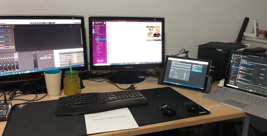 Jede Menge Monitore für den Livepodcast. Eine Arbeitsumgebung eben.