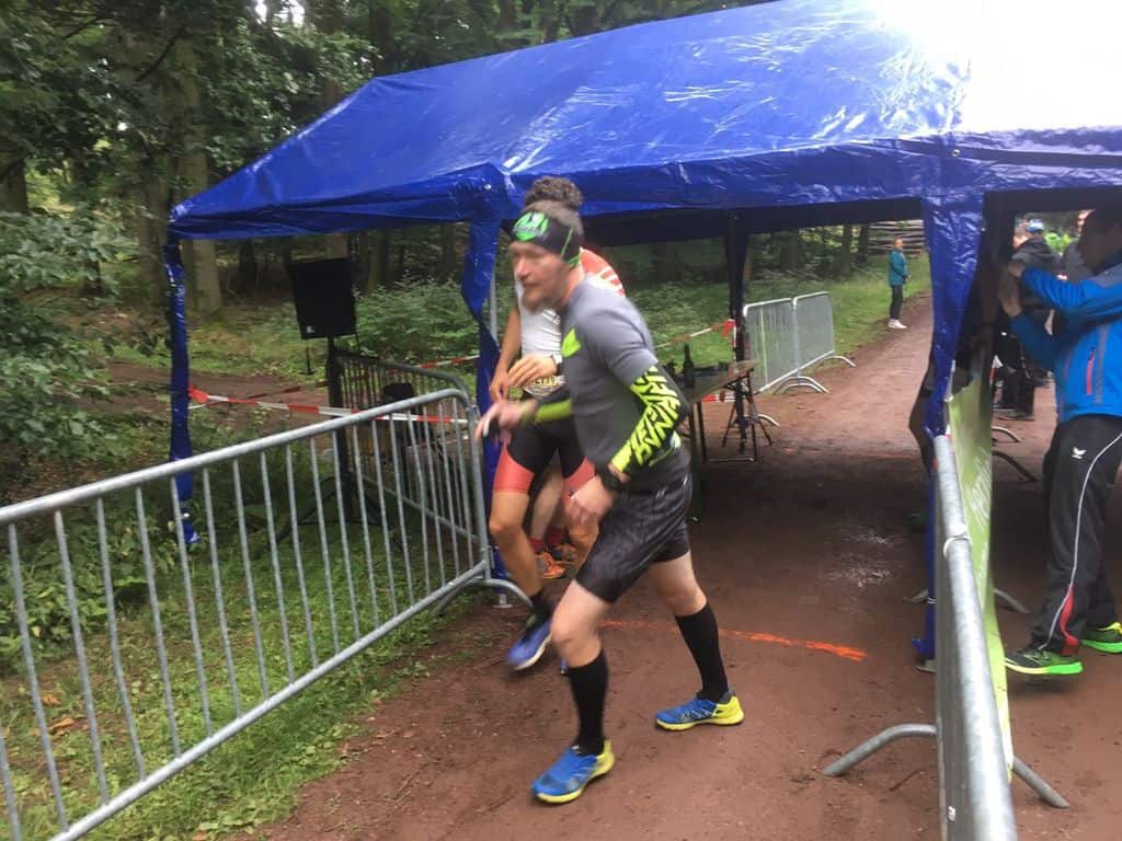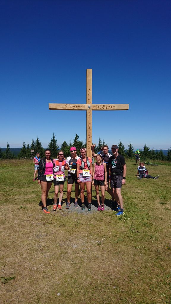 Weiter Richtung Ziel, erst etwas schwerfällig, zu viel Flüssigkeit im Bauch…aber dann lief es wieder halbwegs rund. Mit der Trinkfalsche in der Hand, die von Anfang bis Ende heute, auch als Klimaanlage/Dusche fungierte, munter weiter. Es bergab mal laufen lassen, ging aber weiterhin nicht. Spätestens am Schmiedefelder Skihang war das Spektakel zu hören. Was natürlich zusätzlich motivierte. Und nach 8:47:48 hatte ich das Ding im Sack, war im „Schönsten Ziel der Welt“ angekommen.