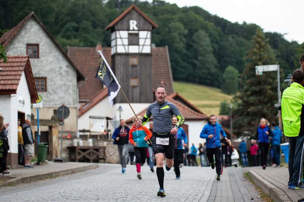 Erst mal bergauf, Richtung Rondell, bergab dann wieder krampfig…egal, Hauptsache ankommen. Und außerdem winkte ja auch bald ein wohlverdienter Schluck Bier an den nächsten Verpflegungen. Die Distanz bis zum Ziel schrumpfte immer mehr, auch konnte ich an allen Anstiegen sauber durchlaufen und einige Läufer einsammeln. Mit Hopfenpower lief es ganz gut. Eine letzte Sitzpause gab es an der Schmücke bei Kilometer 64,4 in 7:41:20, auch hier ein Top Team an der Verpflegung (z.B. Nutellabrot mit Bananenscheiben).