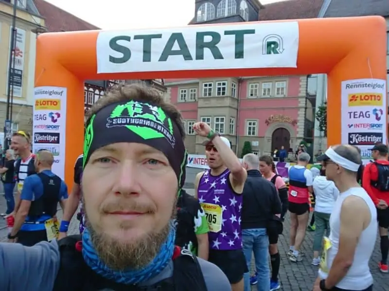 Eine Ungefähre Zielzeit hatte ich auch, wovon mir aber der gute Laufkumpel abriet der uns nach Eisenach fuhr, direkt zum Marktplatz. Super Service Michael! Noch war der Marktplatz überschaubar was Laufverrückte anging. Ole, Wiederholungstäter im zweistelligen Bereich nahm mich „an der Hand „und wir holten die Startunterlagen und suchten fluchs noch das blaue stille Örtchen auf, so lange noch kein Andrang herrschte. Nach seinem Rat stellte ich mich auch nach Abgabe des Gepäckstückes nicht allzu weit vom Startbogen auf, auch um eventuell einen Blick auf den Neuschwander Florian zu erhaschen der den Supermarathon als Training für den Western States 100 nutzen wollte. Ich traf auch noch ein paar Bekannte, meine Begleiter hatte ich inzwischen aus den Augen verloren. Da wir das gleiche Ziel hatten aber kein Problem.