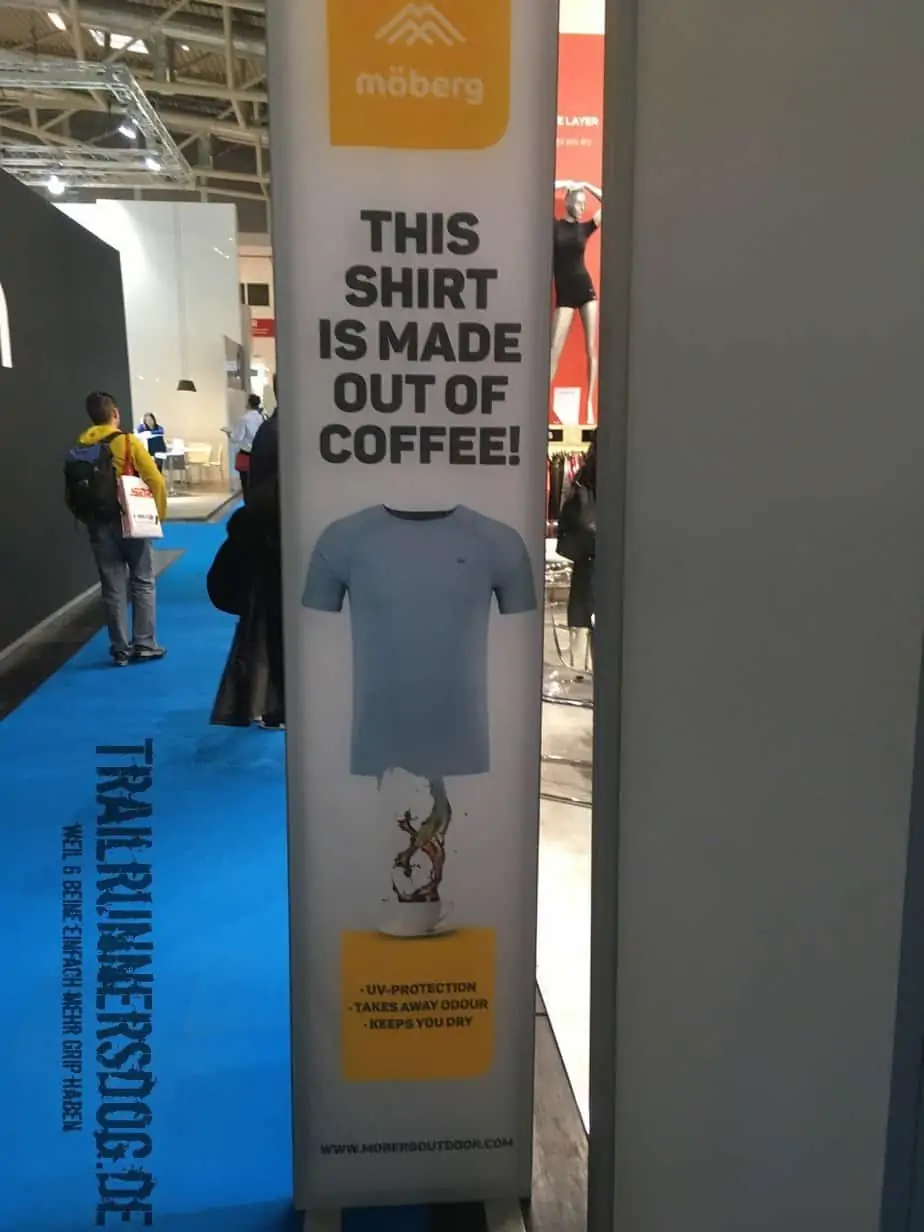 Als wir am Dienstag durch die Hallen schlenderten, sahen wir dann diesen Aufsteller auf dem stand „this shirt is made out of coffee!“. „Öhm warum?“ war so meine erste Frage und mein Interesse war geweckt. Die Firma Fashionpower aus den Niederlanden vertreibt unter der Marke Möberg Outdoor u.a. Bekleidung aus Kaffee-, Vulkangesteins und Bambusfasern. Interessantes Konzept hier auf natürliche Stoffe zu setzen und hoffentlich etwas was Zukunft haben wird, leider setzen sie aber auch weiterhin auf Merinowolle und Chitosanfasern, sprich zerkleinerten Insektenpanzern. Grade Merinowolle hat für mich einen unethischen Beigeschmack, da die Gewinnung alles andere als tierfreundlich abzulaufen scheint. Das ist aber ein generelles Merinoproblem und keines von Möberg speziell.