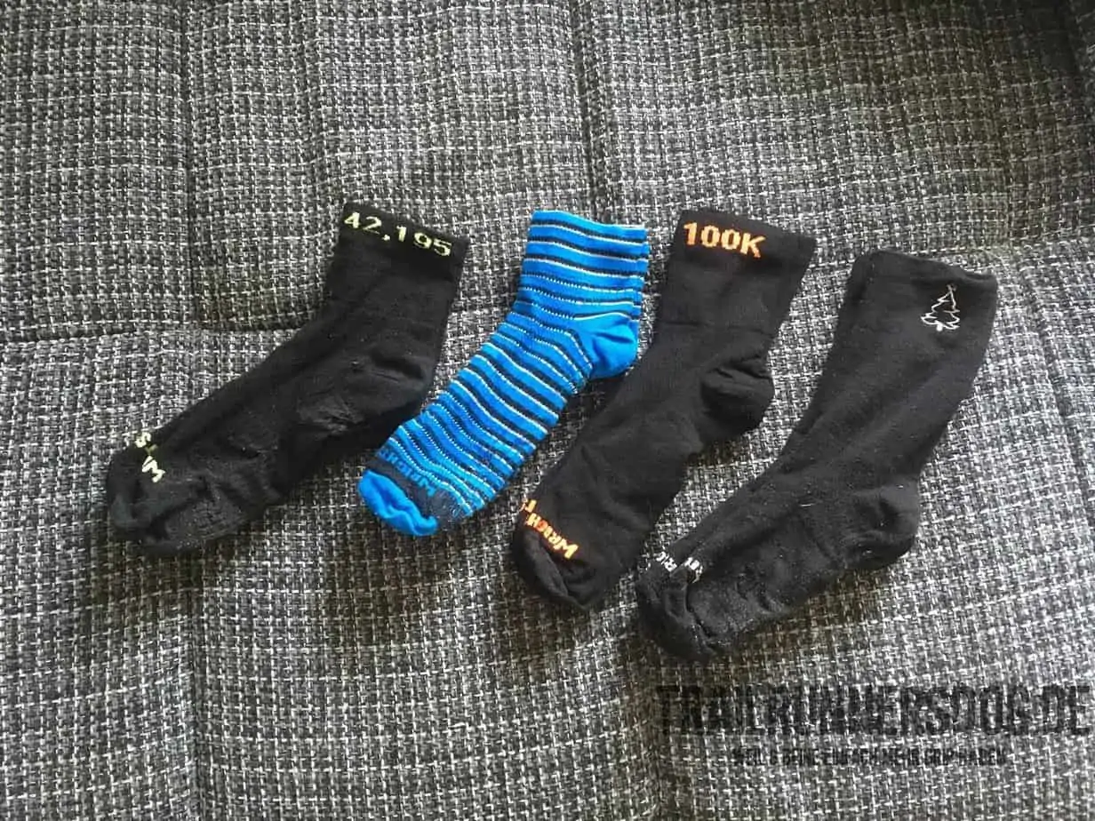 Die „42,195“ und die geringelten Modelle haben mittlerweile schon jeweils um die 30 Stunden und viele Kilometer auf dem Buckel, da ich sie außer beim Brockenmarathon, auch beim Kleiner-Kobolt und zuletzt beim Taunus Ultra Trail getragen habe. Die beiden Letzten sind recht anspruchsvoll und das bekommen dann eben auch die Socken als direkte Verbindung von Läufer zu Schuh zu spüren.