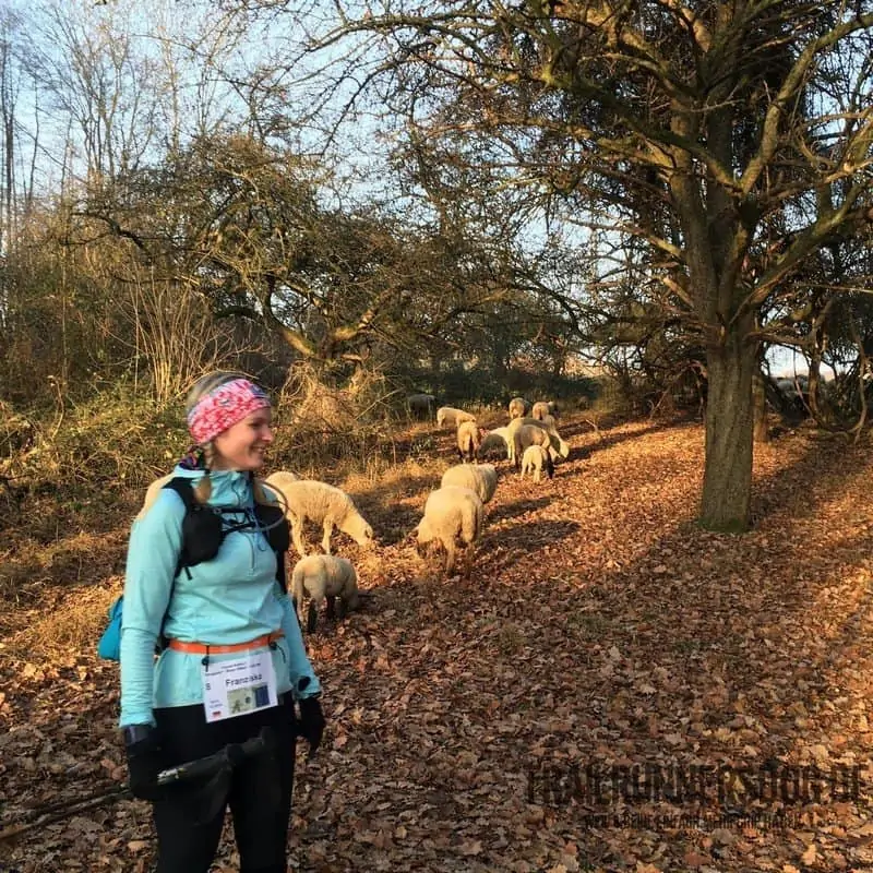 Frau Laufstrumpf schwärmte zwischendurch nämlich auf jeder Kuppe darüber wie schön das „mit den Bergen dahinten“ so aussah. Ich schätze wenn man hier öfter läuft gewöhnt man sich zu schnell an den Anblick. Nach nur 6 km überholte uns der erste der Glorreichen 7, Tobias Krumm. Aktuell sind die Ergebnisse noch nicht online, aber ich gehe mal davon aus dass er das Ding auch gewonnen hat. Den relativ flachen Kölnpfad über 172 km lief und gewann er übrigens in 18:21 Stunden, den 140er KoBoLt hat er 2014 und 2015 auch gewonnen. Seine DUV Statistik ist trotz seiner noch jungen Ultralaufkarriere jetzt schon der Hammer.