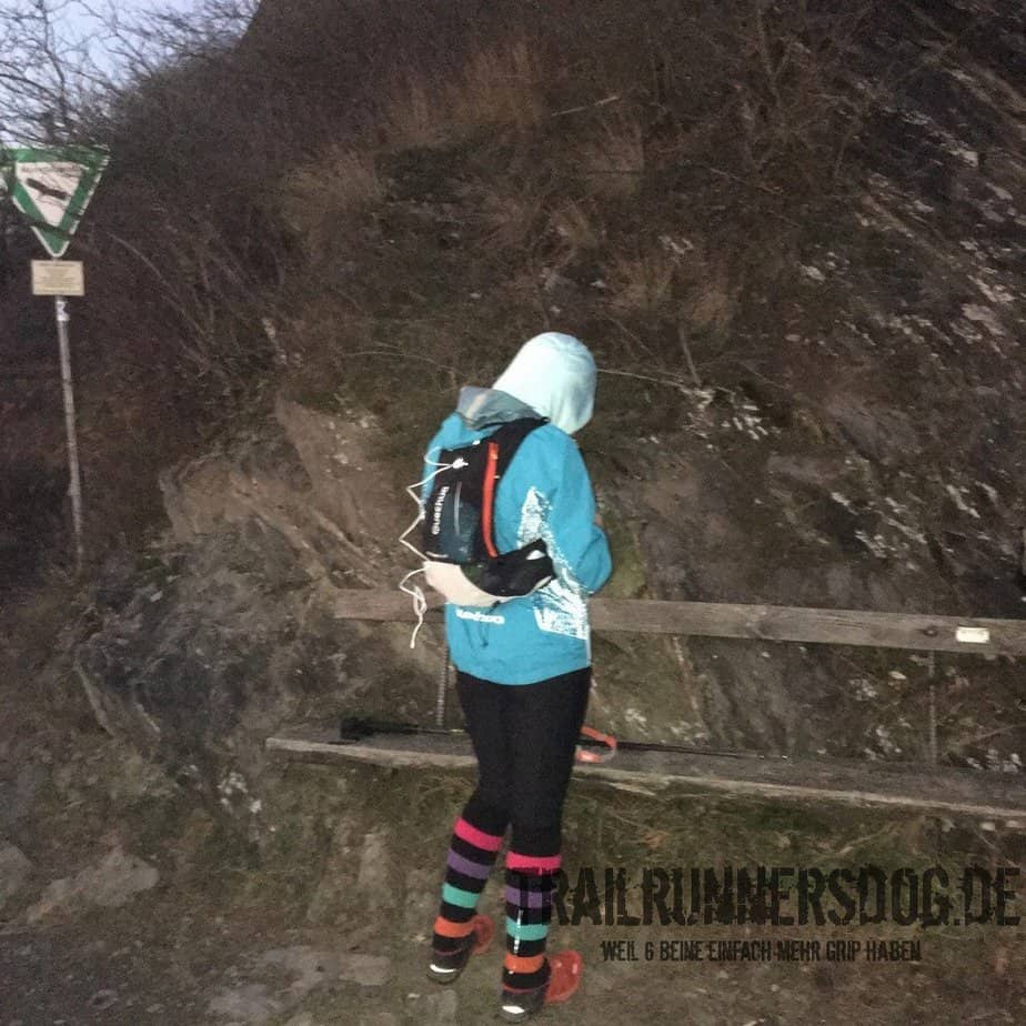 Ich merkte dass ich es sonst gewohnt bin etwas früher an einen VP zu kommen, denn meine 1,5 Liter Wasser waren komplett aufgebraucht. Warum zu Höhle ich nur die Blase mitgenommen habe und nicht noch eine oder zwei Softflasks weiß ich nicht so genau. Ich kann es mir nur so erklären dass ich eigentlich mit kälterem Wetter und somit gefrorenen Schläuchen an den Flasks gerechnet hatte, denn ich hatte auch meine Isolation am Schlauch der Trinkblase angebracht. Ziemlich unnötig bei den Temperaturen ehrlich gesagt. Frau Laufstrumpf hing mir auch schon seit ein paar Kilometer in den Ohren dass sie Hunger hätte. Es wurde also wirklich Zeit für den VP.