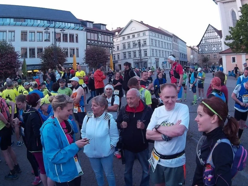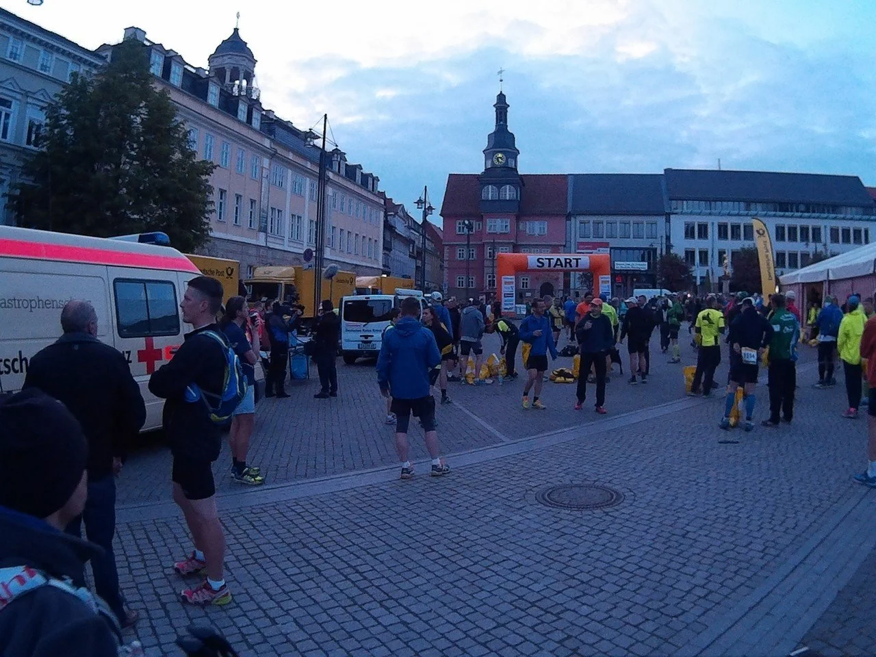 Am Eisenacher Markplatz trafen wir dann Katharina, Franziskas Schwester die auch München angereist war. Für die beiden Schwestern sollte der Rennsteig Supermarathon die quasi Generalprobe für den ZUT über 80 km in Juni sein, für mich ein langer Lauf für den Rheinburgenweglauf und den Kölnpfad. Demnach hatten wir, bzw. die Mädels nur ein grobes Zeitziel von sub 10 Stunden vor Augen. Ich wollte „einfach“ nur hinterher laufen und mich nicht kaputt machen.