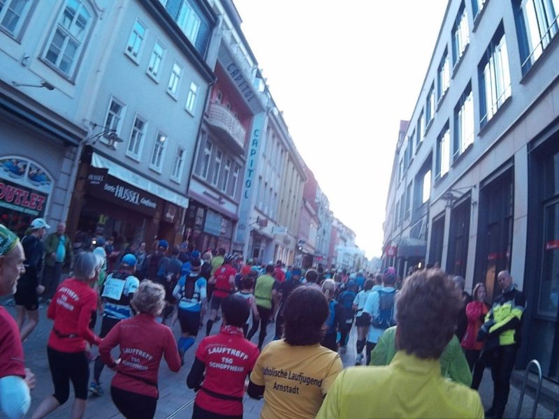 Die ersten X-Hundert Meter geht es durch die Eisenacher Innenstadt, vorbei an Zuschauern die fleißig anfeuern. Die treuen, immer freundlichen und motivierenden Zuschauer sind schon eine tolle Sache und sind definitiv ein Aushängeschild für den Rennsteig Supermarathon. Nur so kann eine Veranstaltung es schaffen 44 Ausgaben stattfinden zu lassen und immer weiter zu wachsen.