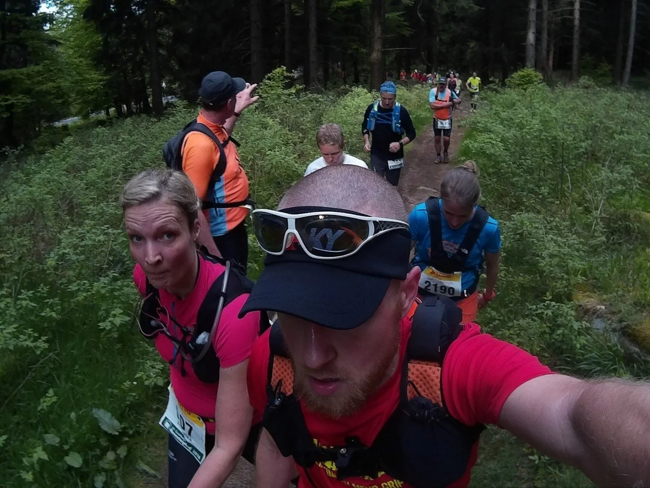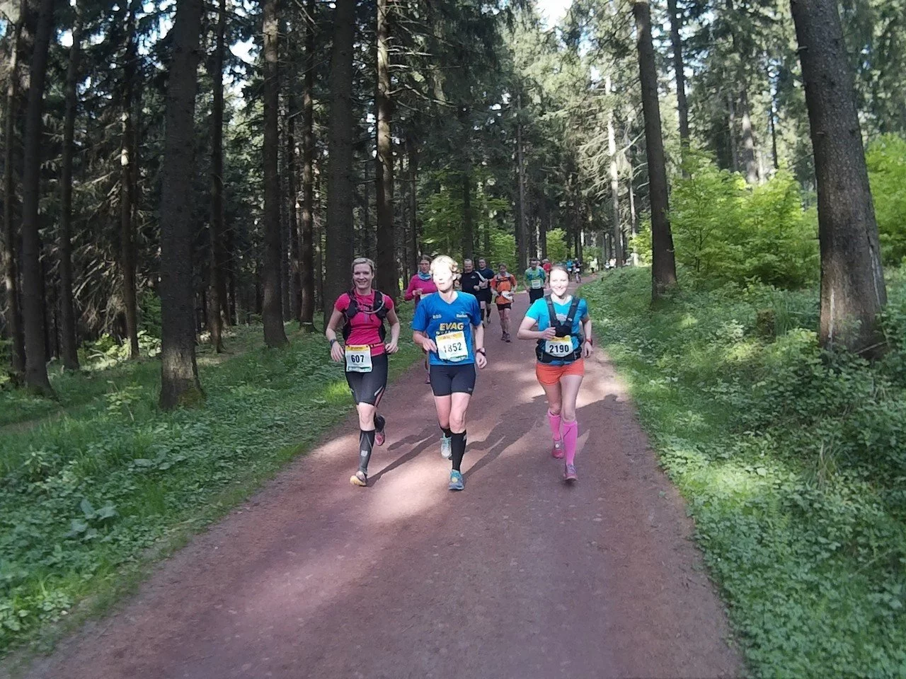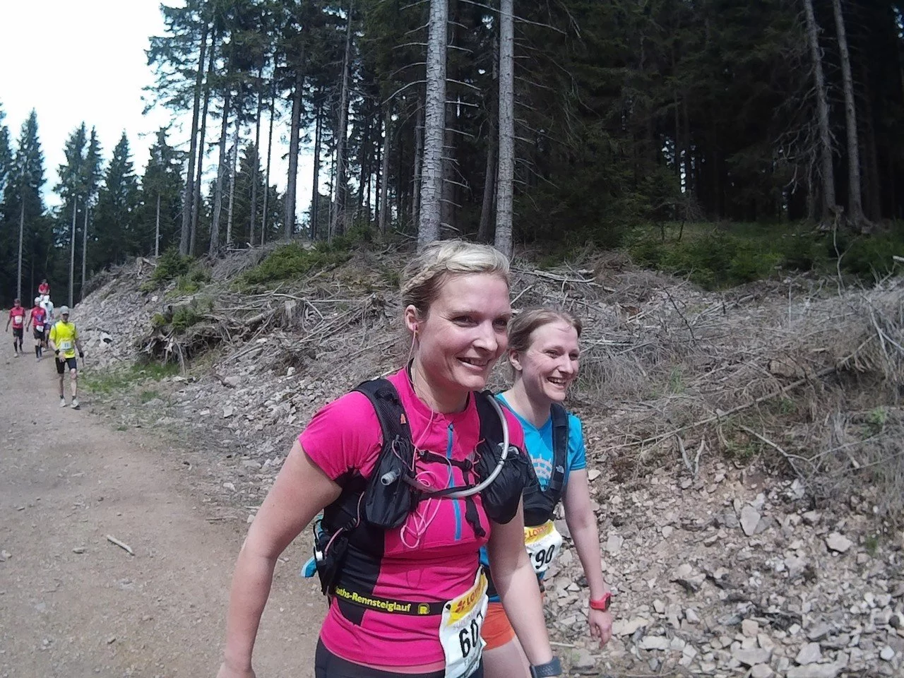 Natürlich haben die beiden nicht darauf gewartet dass ich wieder vom Turm steige, sondern sind weiter gelaufen. So durfte ich mal wieder den beiden hinterher rennen und zog mir so vielfach verdutzte Blicke zu. Wenige Läufer waren in unserem Teil des Feldes noch in der Lage Zwischensprint einzulegen, die meisten waren jetzt schon damit beschäftigt den Lauf einfach zu finishen. Mir machte es riesigen Spaß den Mädels hinterher zu sprinten, denn erfreulicherweise ging das jederzeit problemlos und mein Puls sank binnen ein paar hundert Meter wieder auf das Durchschnittsniveau von 72% HFMax. Der Rennsteig war also ein idealer Trainingslauf und meine Zuversicht sowohl den Rheinburgenweglauf in zwei Wochen als auch den Kölnpfad erfolgreich zu beenden stieg mit jedem Kilometer. Tolles Gefühl wenn sich das Training bemerkbar macht. Andererseits wäre es zum jetzigen Zeitpunkt auf fatal wenn ich auf 72 km massive Probleme bekommen hätte.