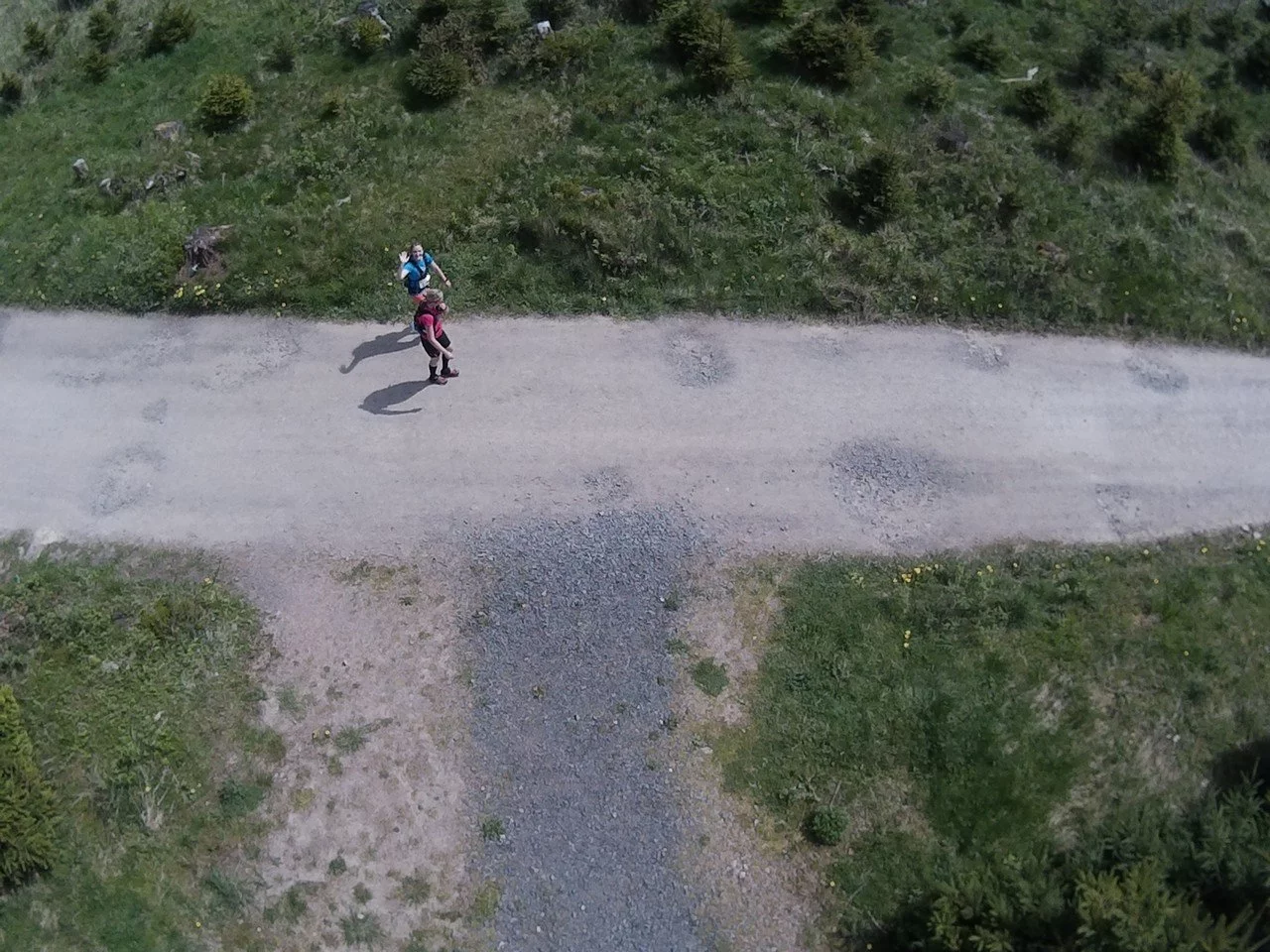 Bemerkenswert fand ich, dass beide trotz der Anstrengung und Belastung weiterhin die laufbaren Anstiege eben hoch liefen und nicht wie mittlerweile eigentlich alle um uns herum ins Gehen verfielen. Das behielten wir dann auch bis zum Schluss so bei, was gerad hintenraus dafür sorgte dass wir ordentlich Läufer (und mittlerweile auch Wanderer) überholen konnten. Dank meiner unverwechselbaren, motivierenden Art kam dann auch dieser kurze Dialog zustande.