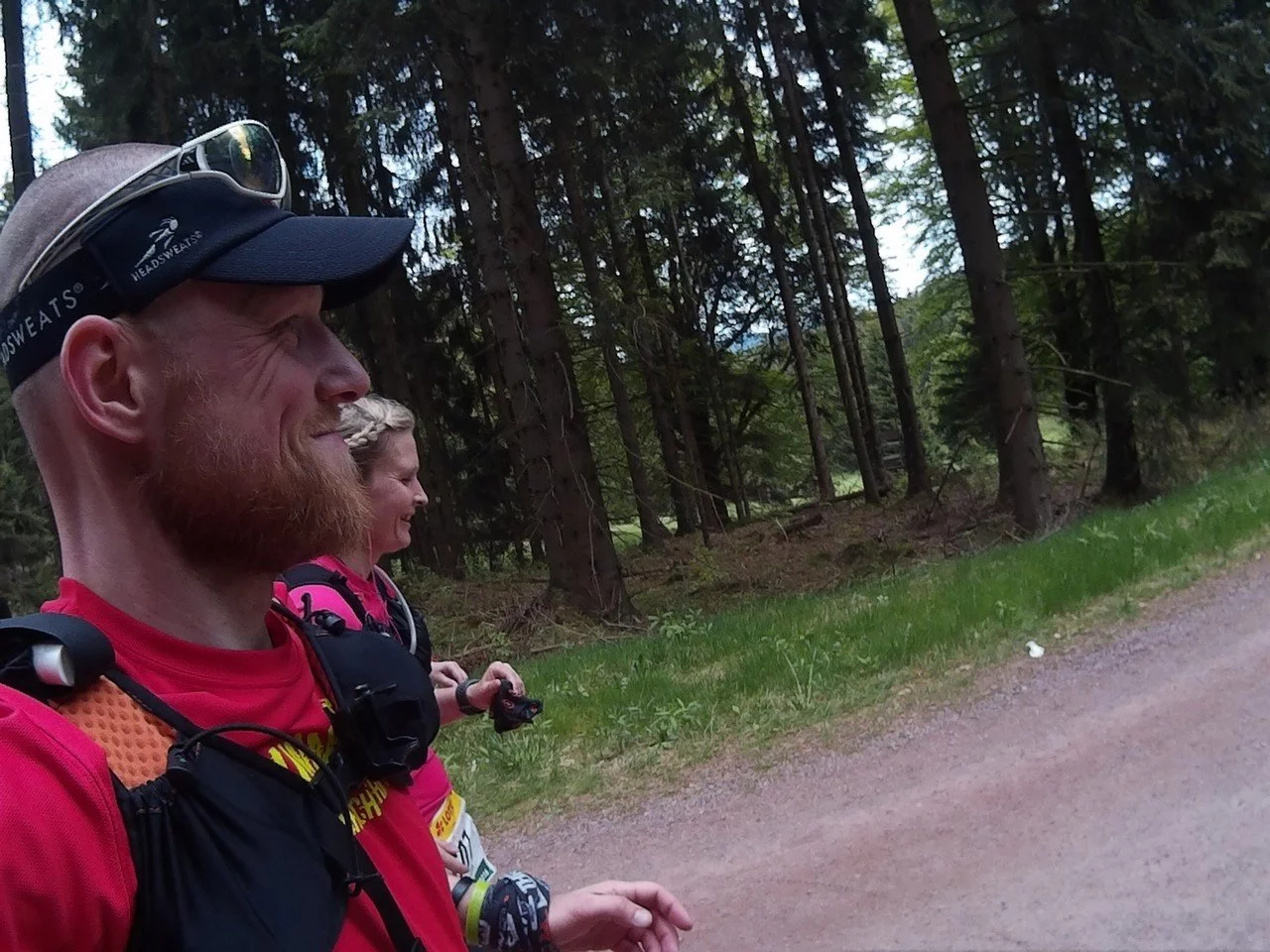 Aber sie hatten natürlich vollkommen Recht, während um uns das „Elend“ begann und immer mehr Läufern auch die fortgeschrittene Belastung und die vielen Kilometer buchstäblich anzusehen war, liefen wir stur unser Tempo weiter. Auch wenn es auf der Strecke in der zweiten Hälfte flacher wurde weil wir eben auf der Höhe angekommen waren, finde ich es beachtlich dass wir einen negativen Split liefen. Da wir viele Läufer die uns zu Beginn bereits überholten wieder eingesammelt haben, weiß ich dass nicht alle dazu in der Lage waren. Alleine vom letzten VP bzw. Messpunkt „Schmücke“ bis ins Ziel konnten wir 6 Sekunden pro km gut machen. Auch wenn es dort größtenteils abschüssig war, muss man das auch erstmal schaffen mit 64 km in den Beinen. Der harte Fortwirtschaftsweg machte das nicht einfacher.