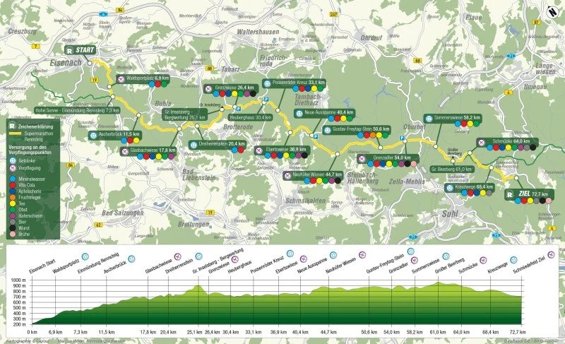 Der Rennsteiglauf ist mit aktuell 44. Auflagen sowohl einer der ältesten und mit in diesem Jahr über 16.000 Teilnehmern auch einer der größten Landschaftläufe Europas. Der Rennsteig an sich ist ein Höhenweg über den Kamm des Thürinder Waldes und des Thüringer Schiefergebirges. Auf 169,3 km kann man dort wandern, radwandern oder eben laufen. Zumindest die Rennsteiglaufstrecke verläuft zum größten Teil auf breiten Waldwegen mit einem recht kleinen Asphaltanteil, wie so oft auf Wanderwegen eben immer dann wenn man in die Ortschaften kommt oder Straßen überqueren muss. Mit an die 1800 Hm auf der Supermarathon Strecke (72,6 km) auch nicht ganz flach, es gibt dort zwar kaum große Anstiege (ja, das ist Ansichtssache), aber das ständige Auf und Ab ist dennoch nicht ganz einfach zu laufen.