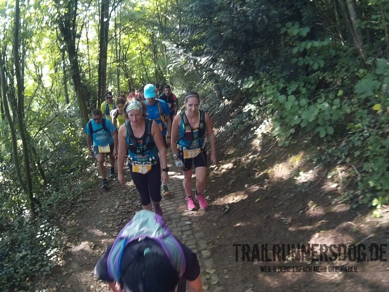 Hier staute es sich dann logischerweise etwas, was uns aber denke ich nichts ausmachte. So konnten wir wenigstens ohne schlechtes Gewissen Teile bergauf gehen. Naja die Zeiten in denen ich ein schlechtes Gewissen beim Gehen hatte, sind schon längst rum. Einige der Läufer die dort hoch liefen, sollten wir später entweder auf der Strecke oder lange nach uns im Ziel wiedersehen. Das passiert auf der langen Strecke regelmäßig und auch auf „nur“ 35 km muss man sich halt seine Körner vom ersten Schritt an einteilen. Ein guter und vor allem erfahrener Läufer kann das in der Regel, der Rest geht eben ein.