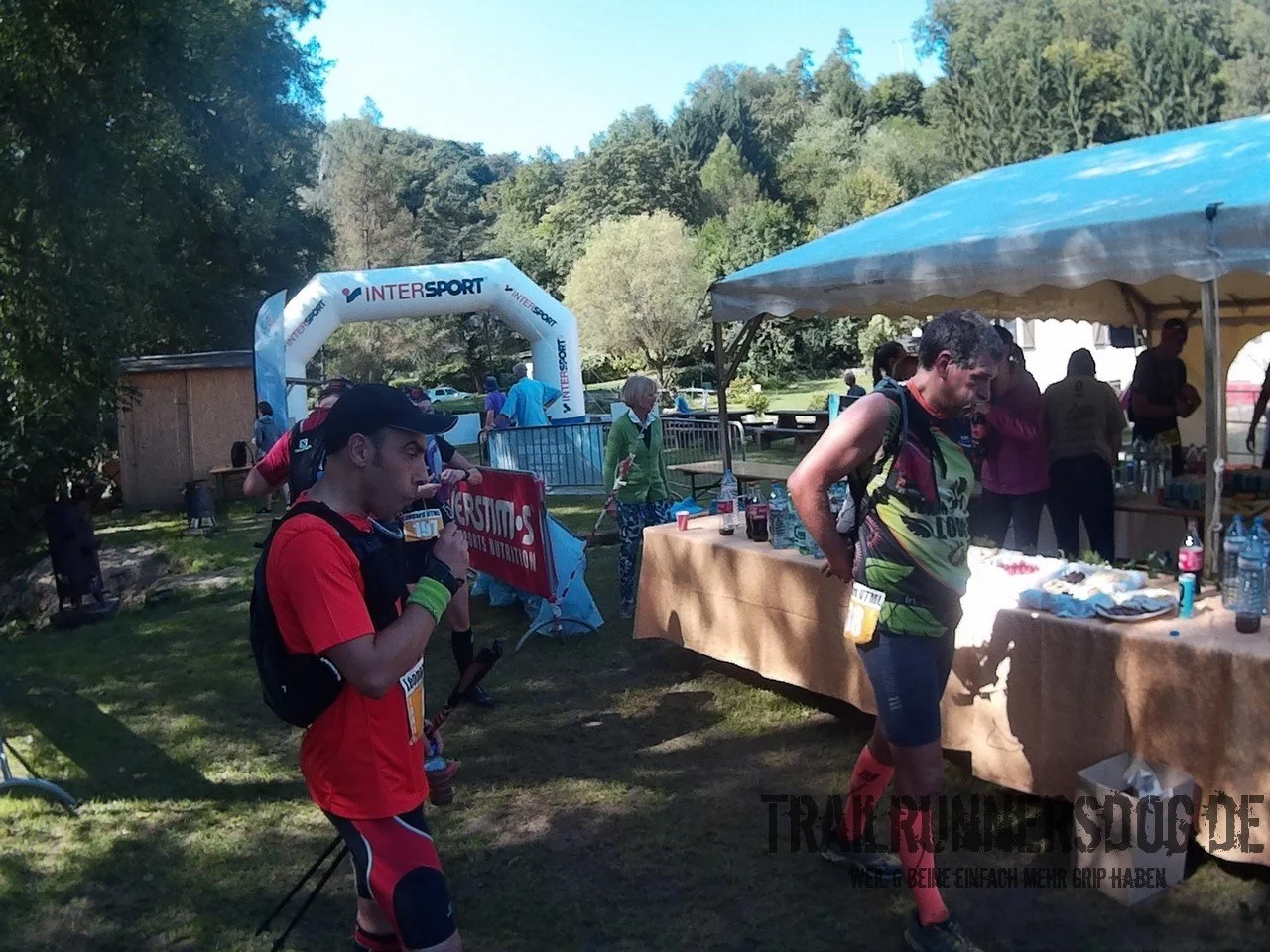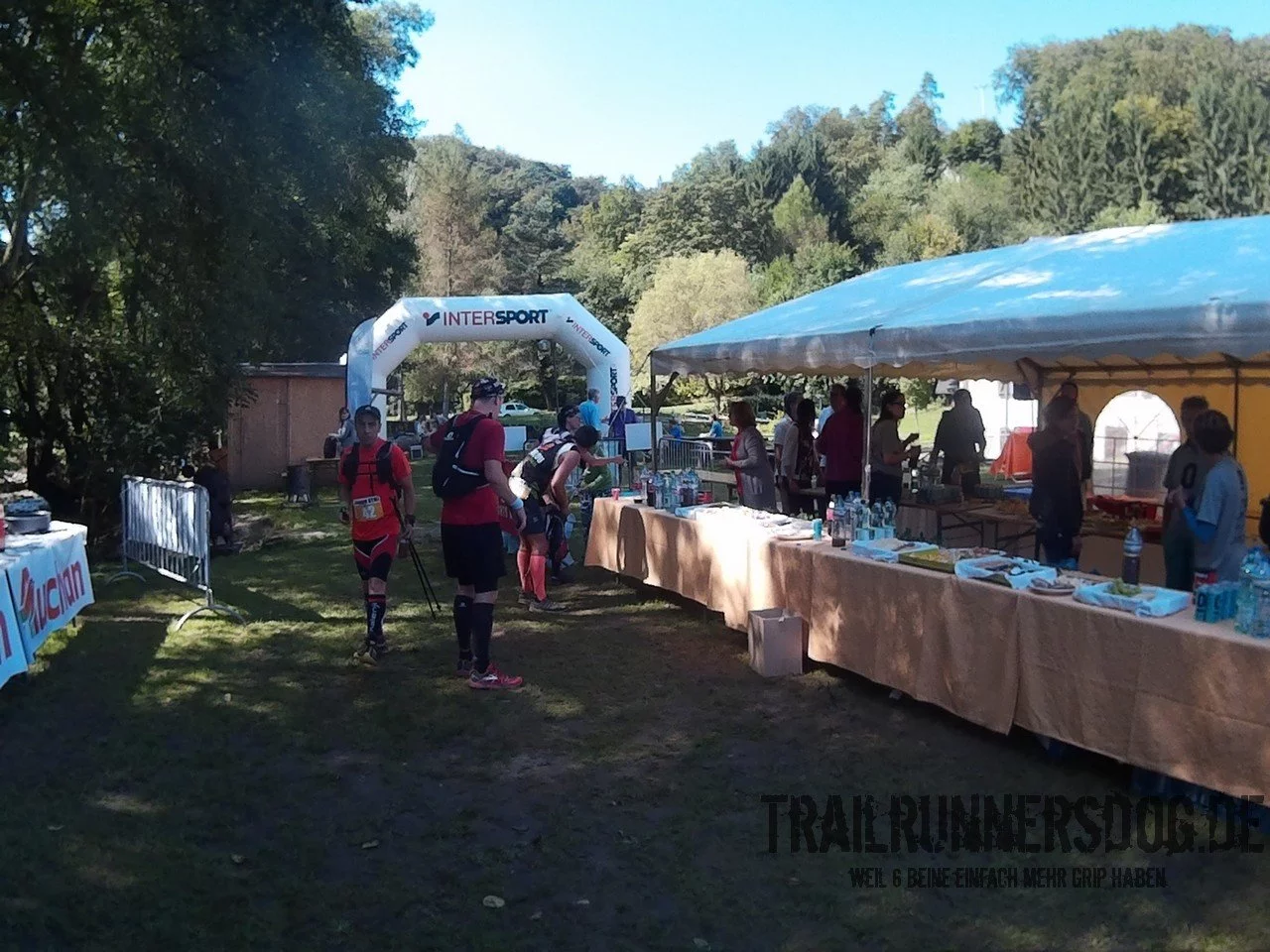 Als ich davon erfuhr, klickte ich mich auf die Veranstalterhomepage und sah dass alle drei Strecken ausgebucht waren. Klar, wer zu spät kommt den bestraft das Leben. Kennt man ja. Der UTML war aber jetzt wieder in meinem Kopf präsent und die Erinnerung an den tollen Tag im April ließen mich grübeln. Die 112 km Strecke war schon rein vom Trainingsstand unvernünftig, die 75 km Strecke wäre drin gewesen. Allerdings nicht als Selbstversorger. Es blieb also „nur“ die 35 km Strecke, die die auch Carina laufen wollte. Ich scherzte also im Vorfeld etwas herum dass ich sie begleiten würde, unser erstes Treffen bei der Brooks Tour in Koblenz machte ja ein geschäftlicher Termin zu nichte. So packte ich also am Vorabend meinen Rucksack, da es warm werden sollte legte ich mein Hauptaugenmerk auf die Wasserversorgung. Ich würde also 2,5 Liter Wasser durchs Müllertal schleppen um die 35 km zu überstehen. Futter war nicht so wichtig, da begnügte ich mich mit einer Packung Studentenfutter und ein paar Softfeigen. Ins Wasser kamen dann auch keine Kalorien sondern nur Elektrolyte. Da der Startschuss erst um 10:00 (wie geil ist das denn bitte??) fallen sollte, hatte ich sogar noch ausreichend Zeit zu frühstücken (einmal daheim und einmal im Auto) und konnte so wie gesagt größtenteils aus Nahrung unterwegs verzichten.