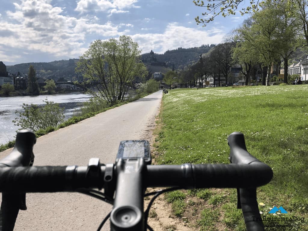 Auf dem Rückweg rollte das Rad dann recht gut, auch mit weniger Druck und so reifte der Gedanke an eine andere Stupidität. Ein 30er Schnitt wäre doch toll. Hatte ich bisher noch nicht geschafft. Also Gas gegeben und Druck auf die Pedale. Moselabwärts geht es ja zum Glück quasi bergab…oder so.
