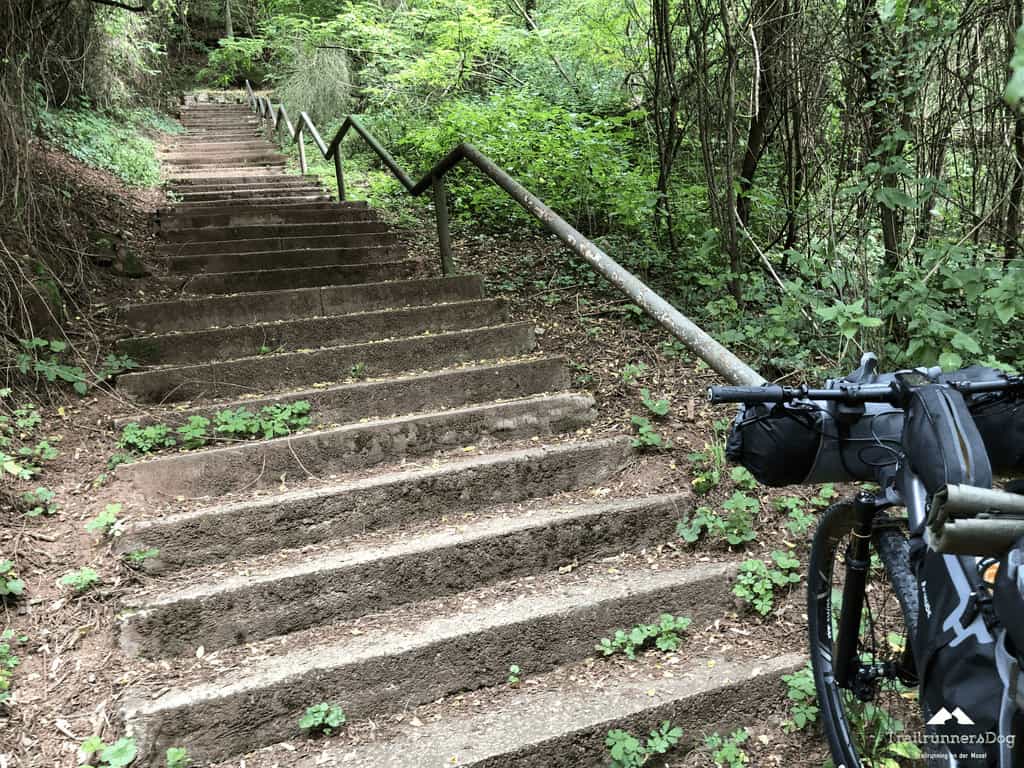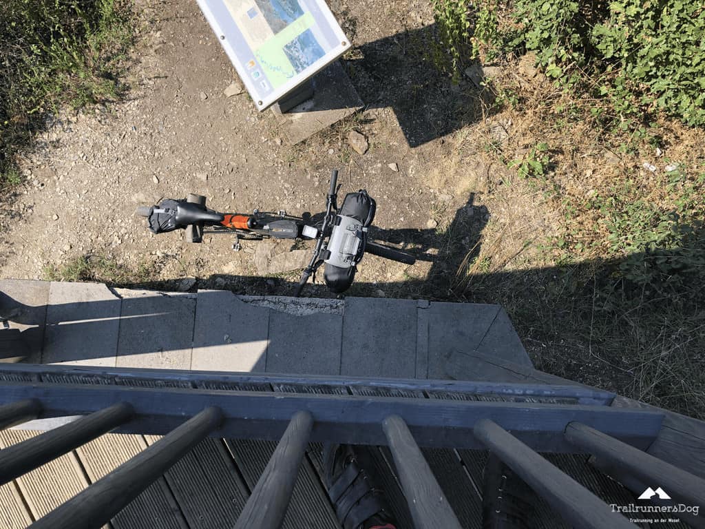 Die ersten Kilometer führten mich durch Trier und den Trierer Hafen, beides nicht unbedingt das, worauf ich mich gefreut hatte. Nach schier endlosen 14 Kilometern stand ich dann plötzlich vor unzähligen Treppenstufen. Ab hier begann der Moselsteig dann so wirklich, auf einen Schlag mit Puls bis zum Anschlag. Bis dahin rollte ich nur locker an der Mosel entlang, das hohe Gewicht des Exceed inklusive Taschen war kein Problem. Das änderte sich schlagartig an der Treppe in Trier Ehrang. Zu den knapp 10 Kilogramm des Exceed, kamen noch 5 Kilogramm an Ausrüstung plus Taschen und mit Sicherheit noch 1-2 Kilogramm an Werkzeug, Ersatzschläuche, Riemen und Schnüre fürs Tarp etc. dazu. Mit dem 2,5 Litern an Wasser und den 2,5 Kilogramm an Verpflegung schleppte ich also gute 22 Kilogramm die Treppe hoch. Grob überschlagen. Ich hatte also erstmal ordentlich Puls und war froh als ich oben angekommen war.
