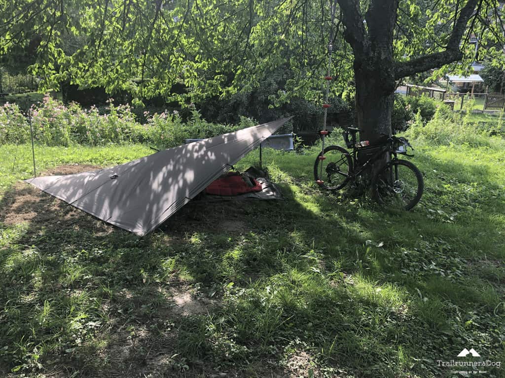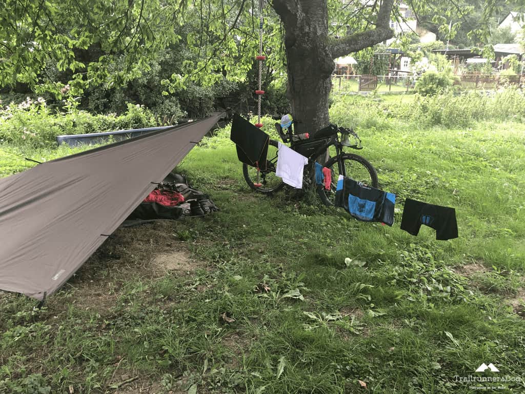 Wie jeden Abend hieß es also wieder, Tarp raus, Heringe rein und fertig ist das Nachtlager. Die ausgewaschenen Radklamotten mussten dieses Mal auf dem Rad trocknen…ganz trocken waren sie morgens aber irgendwie nie. Es gibt definitiv angenehmeres als in noch leicht feuchte Klamotten zu steigen. Aber auch das gehört wohl einfach dazu.