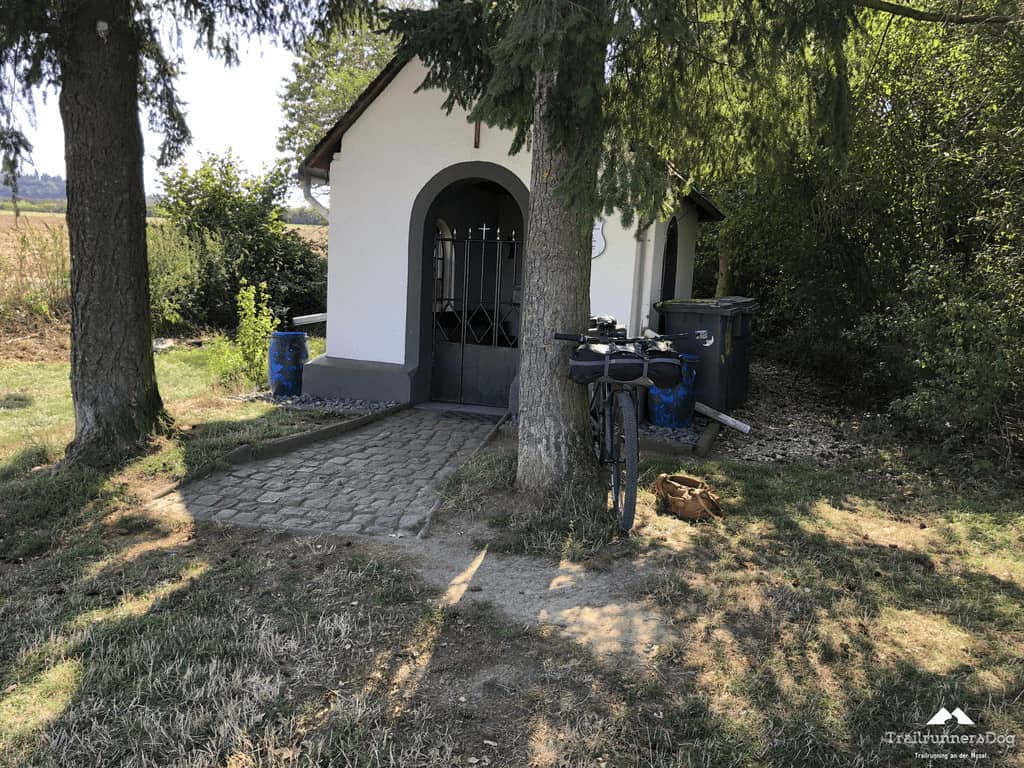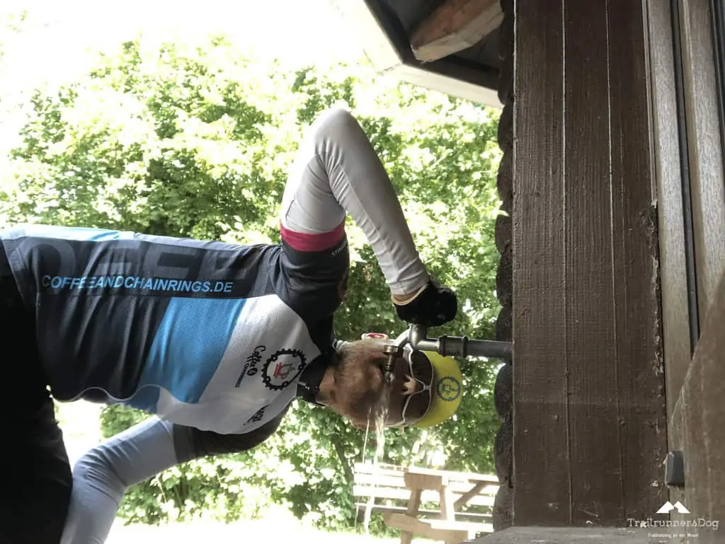 So saß ich dann auch eine Weile in Leiwen am Tennisplatz und labte mich am kalten Wasser. Dort gab es fließendes, kaltes Wasser an einer Grillhütte. Herrlich und gerade zum richtigen Zeitpunkt, denn dank der Hitze im Weinberg gingen meine Wasservorräte zur Neige. Neben der Flasche auf dem Oberrohr hatte ich noch eine weitere im Trinkrucksack, zusätzlich zur 2 Liter Trinkblase.