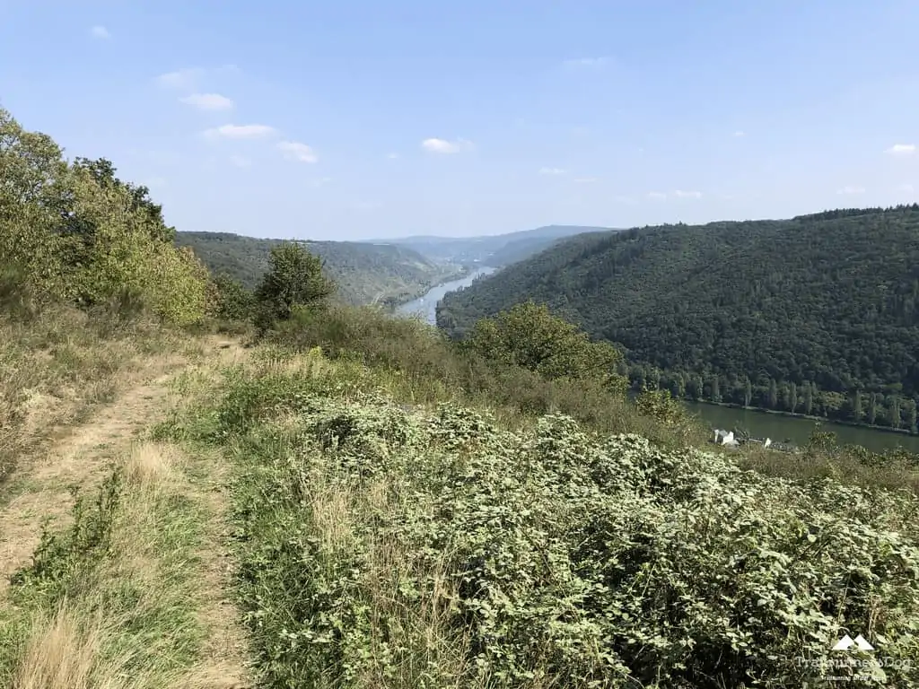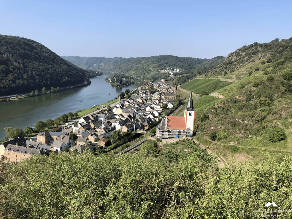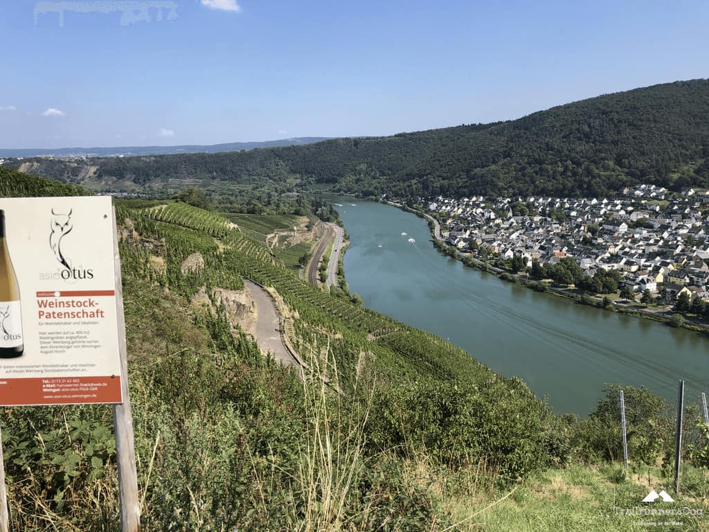Oben angekommen war dann dafür aber die Aussicht klasse. Wie jedesmal wenn man sich die Moselhänge hoch quält…kurz bevor man sie wieder runter „darf“. So ist das aber eben auf dem Moselsteig. Wie im Leben, ein ständiges Auf und Ab.