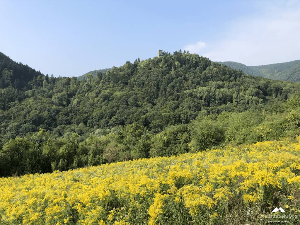 Selbstverständlich ging es gleich zu Etappenstart wieder stetig nach oben. Dort oben konnte man einen Blick auf die Burg Arras erhaschen, Burgen gibt es ja an Rhein und Mosel an jeder Ecke.