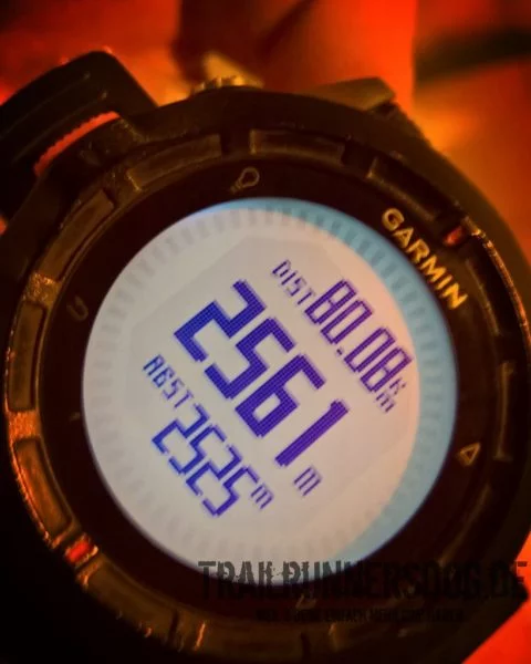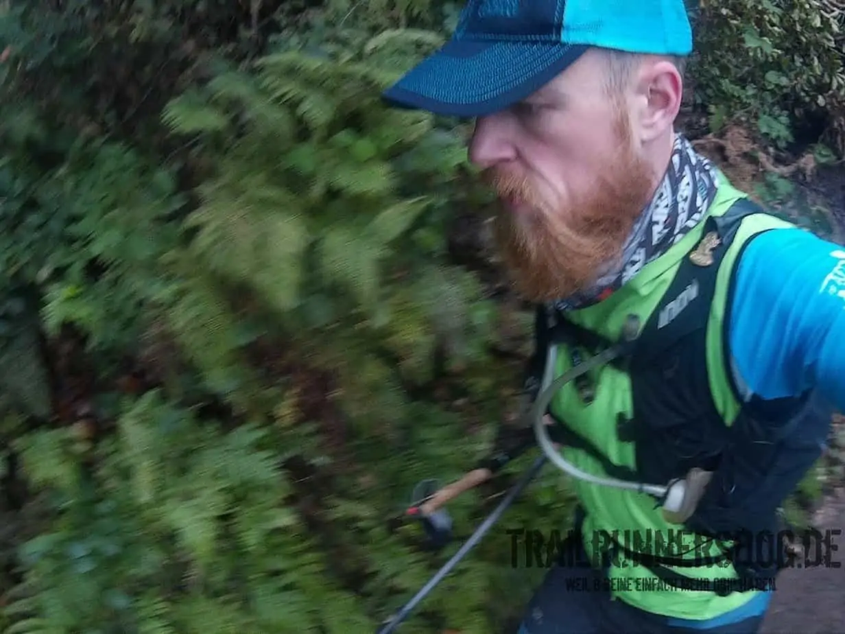 Mit der getragenen Ausrüstung bin ich mehr als zufrieden, auch wenn ich mir doch tatsächlich eine Blase gelaufen habe und das trotz der Wrightsocks. Potzblitz, die sagen doch dass man blasenfrei sein würde… Naja ich weiß aber auch woran es lag, nämlich am Schuh. Der Saucony Peregrin 6 hat eine für mich recht feste Fersenkappe die grade in den Bergaufpassagen immer drückt und reibt. Dafür ist er dann aber auf den Bergabpassagen und Flachstücken echt bequem, wie ich jetzt weiß auch auf der langen Strecke. Die Blase war dann also eher Abrieb als Blase. Nichts was mich großartig behindert hat, zumal das Problem erst recht spät irgendwo bei km 60 oder so das erste Mal auftrat.