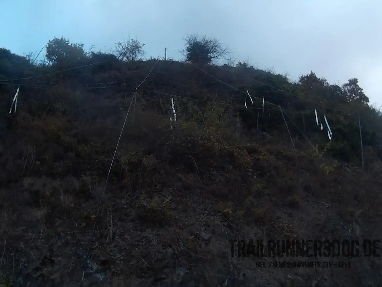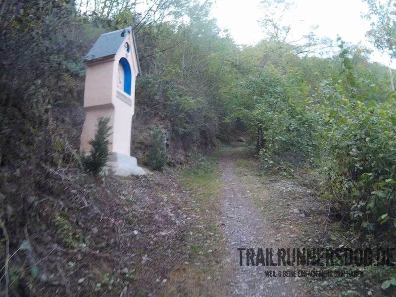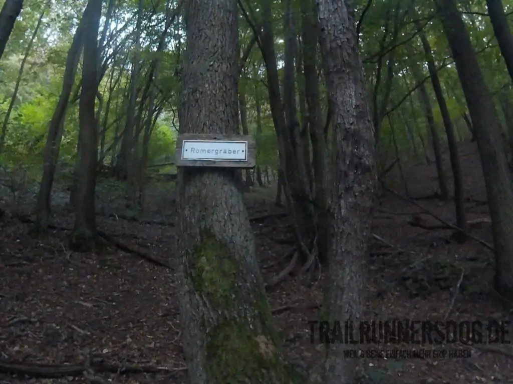 Der Wald oberhalb von Ediger-Eller scheint ein beliebtes Ziel der Generation 40+ zu sein, wer sonst läuft mir Walkingstöcken durch den Wald…oh warte… Mist. Ich hatte ausnahmsweise mal wieder Stöcke dabei. Seit gut 3 Jahren bin ich, egal wie viele Höhenmeter mich erwartet haben immer ohne gelaufen. Warum dann heute? Der kleine KoBoLT findet im Dezember statt, im Dezember kann es dann auch schon mal viel schneien und die Strecke dürfte dann um einiges schwerer zu laufen sein. Da man dort keine Stöcke in die Dropbags packen darf, wollte ich mal wieder das mit den Stöcken testen. Was soll ich sagen? Sie helfen in der Tat ungemein beim Laufen, machen es deutlich einfacher. Ich weiß schon warum ich bisher drauf verzichtet hatte. Nach Fitness mit Stöcken war mir zu dem Zeitpunkt aber trotzdem nicht und so lief ich weiter in Richtung der Römergräber. Das Schild irritierte mich dann aber etwas, denn ich konnte absolut nichts erkennen außer „Dreck“. Ok…das in einer Region die epochenweise stark von Römer bewohnt war auch irgendwo ein paar Knochen in der Erde liegen, liegt auf der Hand. Von daher durchaus legitim einfach mal ein Schild an den Baum zu nageln und Touris zu beeindrucken. Ein paar Hundert Meter sah ich dann ein Schild dass wohl zu den „echten“ Grabanlagen führte, die 800 Meter Umweg hab ich mir dann aber gespart.