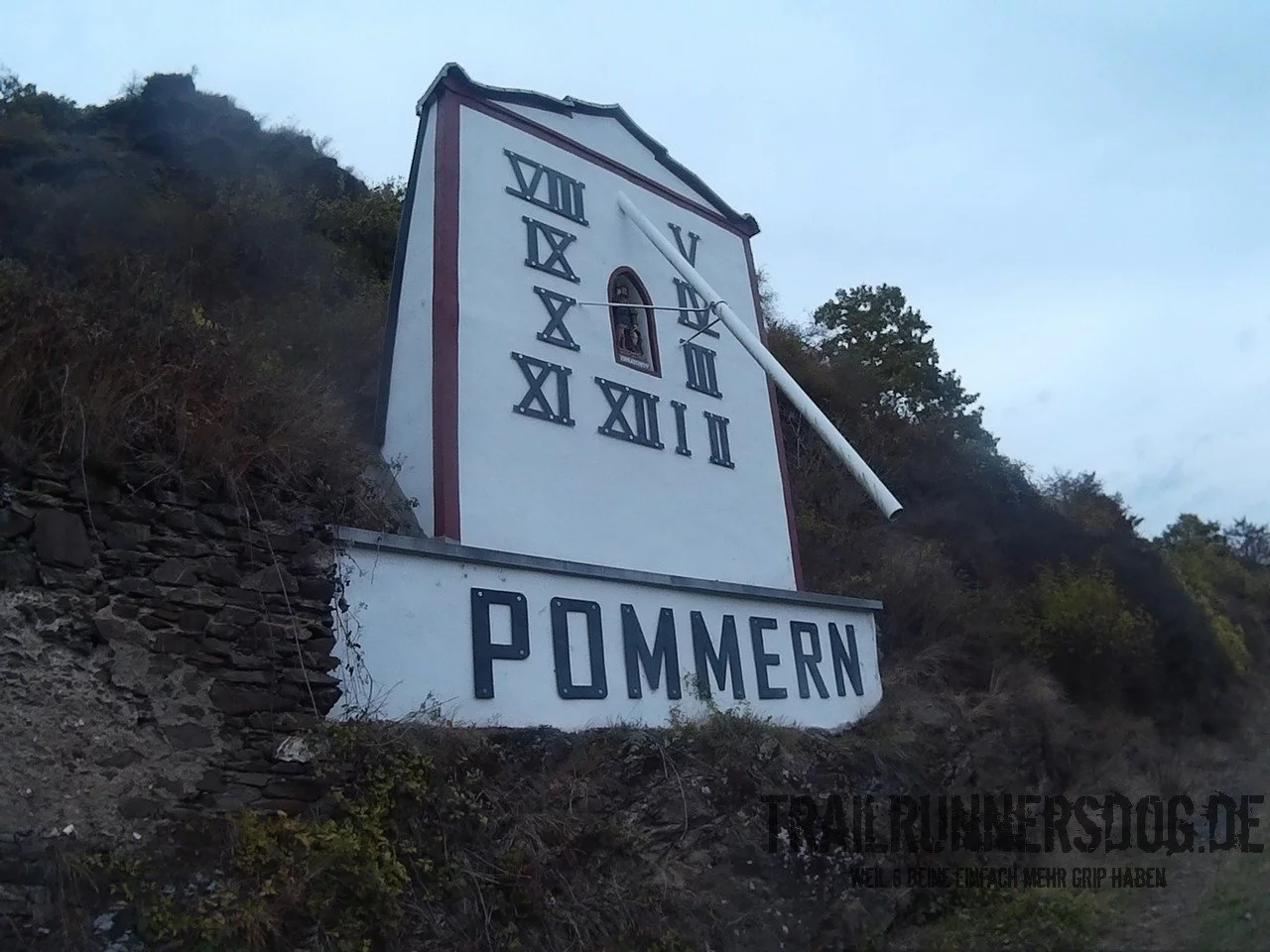 Oberhalb von Pommer steht eine große Sonnenuhr, die mangels Sonne natürlich nicht wirklich funktionierte. Zu diesem Zeitpunkt war ich etwa 8 Stunden unterwegs und hatte an die 55 km auf der Uhr. Langsam reifte der Plan bei Dunkelheit den Moselsteig zu verlassen und mich ab jetzt von Etappenziel zu Etappenziel zu hangeln. Ich hatte allerdings keine körperlichen Probleme, es gab also keinen Grund aufzugeben. Sieht man mal von der Tatsache ab dass ich grade mal die Hälfte der Strecke zu meinem Auto geschafft hatte bis hier hin.