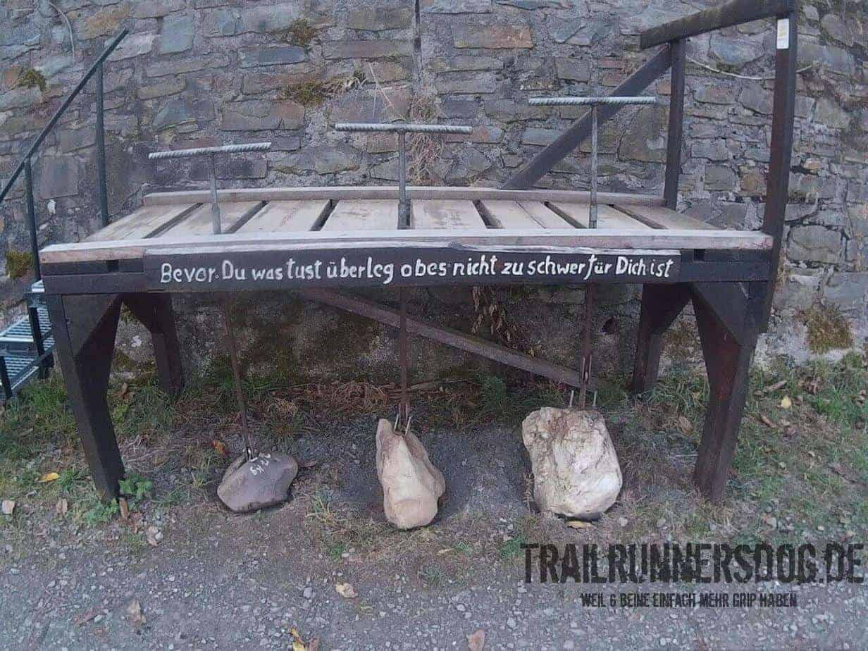 Diesen Spruch fand ich auf einer Vorrichtung mit der man unterschiedlich schwere Steine anheben konnte, wenn man es denn konnte. Ausprobiert habe ich das aber nicht, muss ich gestehen.