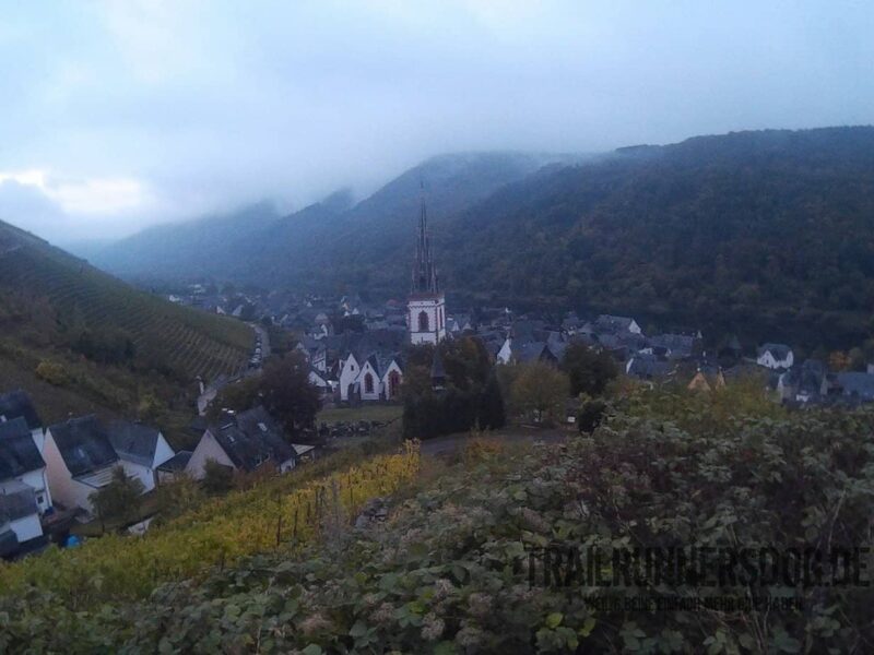 Hinter Pommern, oberhalb Treis-Karden am Gipfelkreuz traf ich auch einen älteren Läufer der dort seine Dehnübungen machte. Wir unterhielten uns kurz und als er fragte wie mein weiterer Plan aussah und von von ich gestartet war hörte ich nur ein kurzes „Oh…“ und sah ein verwundertes Kopfnicken. Knapp 60 km hatte ich dort in den Beinen. Nach ein paar Minuten zog ich weiter in Richtung Buchsbaum Wanderpfad der nach Treis-Karden begann. Nicht ohne noch einen Tipp für eine Abkürzung bekommen zu haben, damit hätte ich mir den Weg durch den Ort gespart. Der Weg war allerdings an dem Tag das Ziel und so blieb ich auf dem Moselsteig.