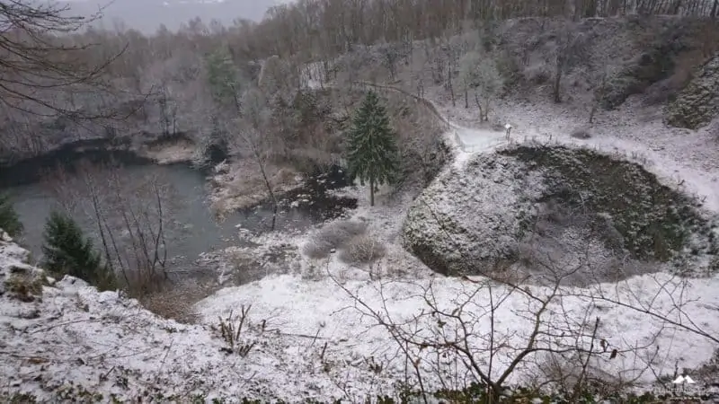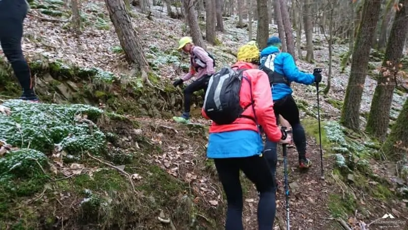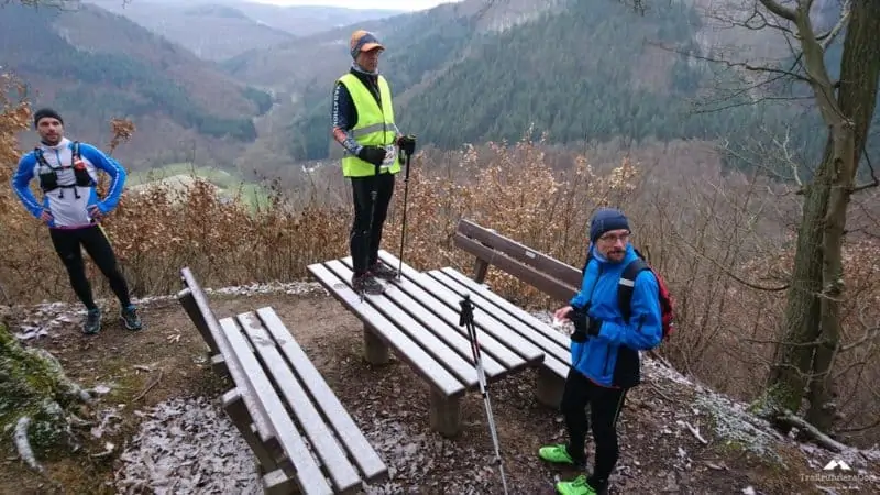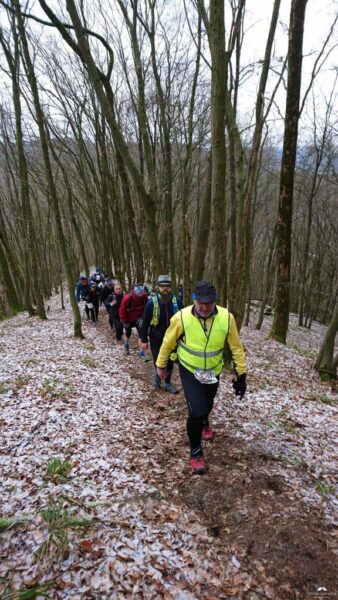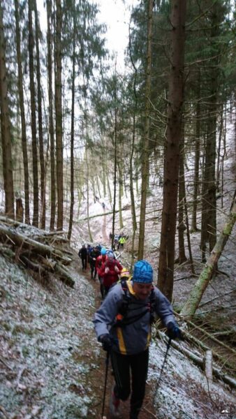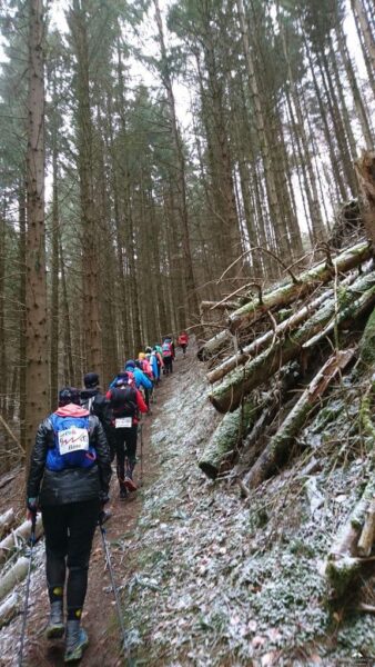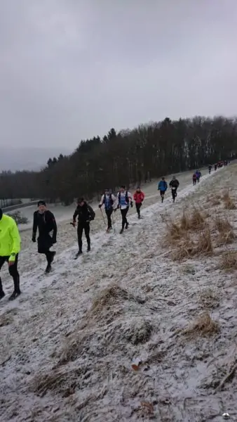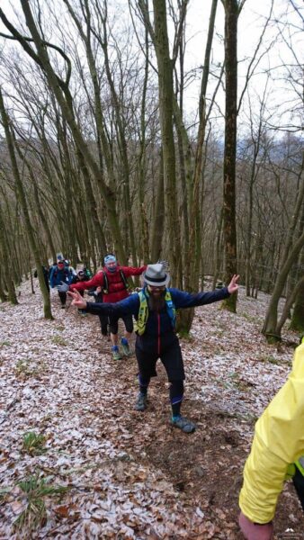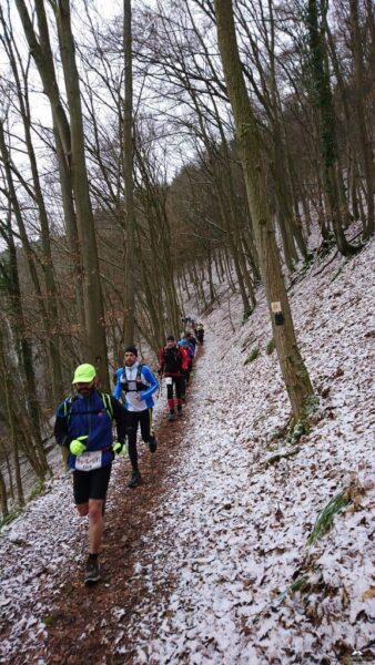 Ab hier hatten wir einen neuen Führungsläufer, Wolfgang ließ sich ablösen. Wunderbare Trails bergab was ich wegen der Kälte aber nicht so toll fand, die Hände schon wieder Eiszapfen. Wann kommt endlich der nächste Anstieg? Der kam zum Glück. Insgesamt muss man aber sagen das dieser Abschnitt, auch wegen der „frische“ des Führungsläufers etwas flotter war, was sich auch durch ein Auseinanderziehen des Läuferfeldes bemerkbar machte. Es ist aber auch nicht einfach über 60 Läufer mit unterschiedlichem Leistungsspektrum unter einen Hut zu bekommen, zumal die „langsamen“ sich auch nicht direkt hinter dem Führer befanden/nicht da laufen wollen. Kenne ich von Lauftreffs bei uns zu Hause sehr gut. Man kann sich gar nicht auf die Geschwindigkeit des Schwächsten einstellen wenn nur die starken Läufer vorne laufen. Und wie gesagt es war kalt, da will ich zulaufen…hat eine Weile funktioniert, bis wir wieder Warten mussten, ein Teufelskreis. Auf dem Streckenabschnitt gab es auch einige Baumhindernisse #kriechenundbücken. Sobald dann der VP3 in Sicht kam gab es kein Halten mehr! Hier waren mir die zehn Minuten Pause aber zu lang, da der Verpflegungsstand auf einem Hügel ohne Windschutz lag, wenn dort nicht noch ein Bus geparkt hätte wären wir davon geweht.
