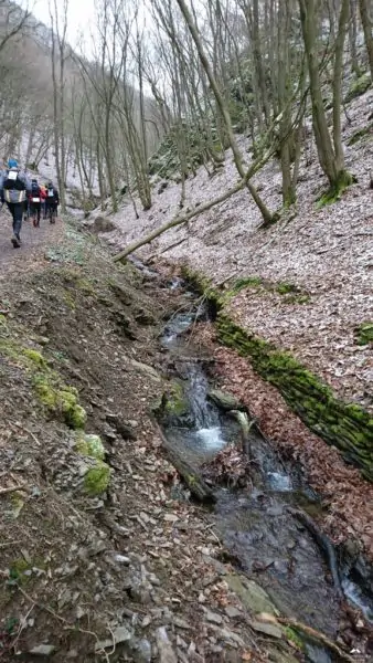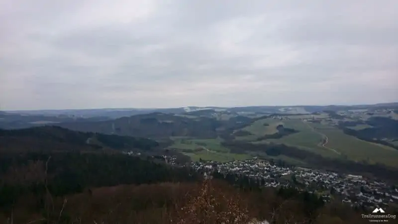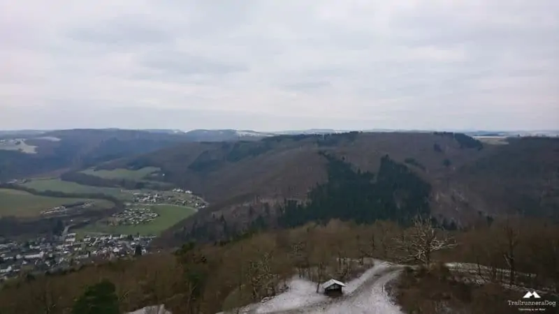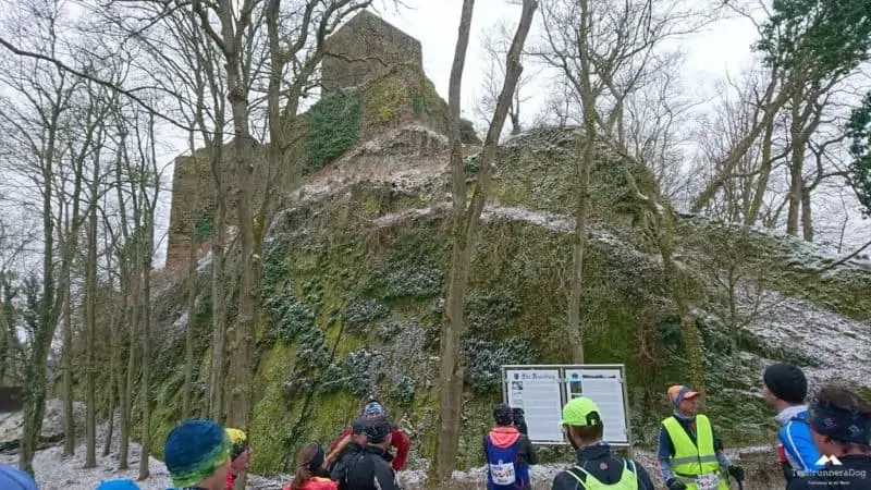 Bis jetzt lief alles super, auch mein linker Oberschenkel den ich mir am Donnerstag zuvor bei meinem ersten Besuch auf der Tartanbahn in diesem Jahr ,leicht gezerrt hatte, verhielt sich ruhig. Vielleicht auch wegen dem halben Pfund Tigerbalm. Einzig die Kälte machte sich nach der Pause wieder bemerkbar, kalte Finger, da hilft nur ein Anstieg um das Blut wieder in Wallung zu bringen. Dieser ließ nicht lange auf sich warten, erst über die Brücke/Wied und dann Berg an. Kurzer Halt oben am Gipfelkreutz mit Blick ins Wiedtal und auf unseren Rastplatz. Weiter ging es über wunderschöne Pfade und zugige Höhenrücken bis zur wildromantischen Neuerburg die heute sogar wieder bewohnt wird. Erbaut von Ludwig dem Zweiten von Thüringen. Wir sind also nicht die ersten „Thüringer“ im Westerwald …Dann trailig nach unten bis ins Nesseltal vorbei an einem alten Bauernhof/Mühle. Bei einem kurzen Halt an einer Kapelle, erfuhren wir das eine Tochter des Hofes “Rosa Flesch“, in Waldbreitbach einen Franziskanerinnen Orden gründete aus dem einer der größten Krankenhaus Träger Deutschlands entstanden ist. Weiter ging es durch das Tal und dann natürlich wieder nach oben, wir wollten ja nicht nur Kilometer sammeln sondern auch noch ein paar Höhenmeter…bis zum VP2 welcher auf einem Parkplatz am Mutterhaus des Klosters in Waldbreitbach gelegen war, direkt vor unserer Unterkunft. Zu den üblichen Verdächtigen an Essen und Trinken kamen noch Kaffee (Steffen war glücklich) und heiße Kartoffel mit Salz, ein Verpflegungstraum vom Feinsten! Gerade bei der Kälte die immer mehr in die Knochen kroch, super toll. An dieser Stelle noch mal herzlichen Dank an Jürgen und sein Versorgungsteam!!!
