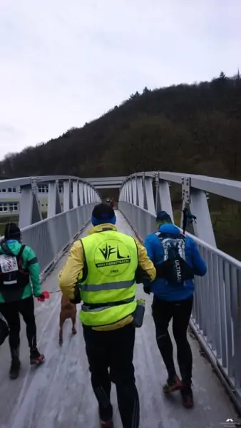 Nach einer Stärkung #kartoffelpower ging es steil nach oben. Ich war seit Mitte des Laufes mit Stöcken unterwegs, erstens um das ganze mal zu testen und mittlerweile auch weil es am Berg wirklich was bringt. Aber nicht nur bei meinen „billigen“ Läuferkrücken, sondern auch bei den Kollegen hatten sich Runde Ablagerungen aus gefrorener Erde an der Spitze gebildet. Das ganze machte den Stockeinsatz schwierig. Oben angekommen musste erst mal gewartet werden bis alle wieder zusammen waren. Eigentlich kein Problem, bei der Kälte schon, es wurde zunehmend schwieriger die Bande zu bremsen. Durch Waldarbeiten war der Weg stark in Mitleidenschaft gezogen worden. Ja auch im Westerwald sieht es teilweise schlimm aus, leider zählt immer noch Geld mehr als Natur. Auf einer zugigen Bergkuppe, wartete Wolfgang auf uns um noch einmal nach seiner Schar zu sehen, der Wind pfiff hier aber auch derartig, das die Mütze vom Führer sich verabschiedete und ich ihn dann kurzerhand auch hinter mir ließ (eigentlich sollte keiner vor dem Führungsläufer laufen), immer der Meute hinterher die vorauseilte und sich hoffentlich auskannte. Nach einem kurzen letzten Anstieg ging es einen schönen Pfad downhill nach Waldbreitbach. Unten angekommen mussten wir dann erst mal wieder warten, kaaalt, ja sogar die Schläuche der Trinkblasen waren eingefroren, bevor wir bis zur Brücke über die Wied weiter liefen. Hier war dann kurz vor dem Ziel finaler Halt bis auch die Letzten wieder aufgeschlossen hatten. Und das war mein Steffen dem bzw. seinem Knie der Schlußdownhill den Rest gegeben hatte. Noch einmal brachten wir gemeinsam die Brücke zum schwanken und liefen überglücklich ins Ziel.
