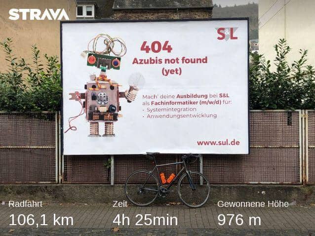 Da wir in meiner Firma aktuell eine Plakataktion zur Azubigewinnung laufen haben, wollte ich dann Samstag eine etwas längere Ausfahrt nach Cochem machen. Dort hinter am Bahnhof hängt ein solches Plakat.