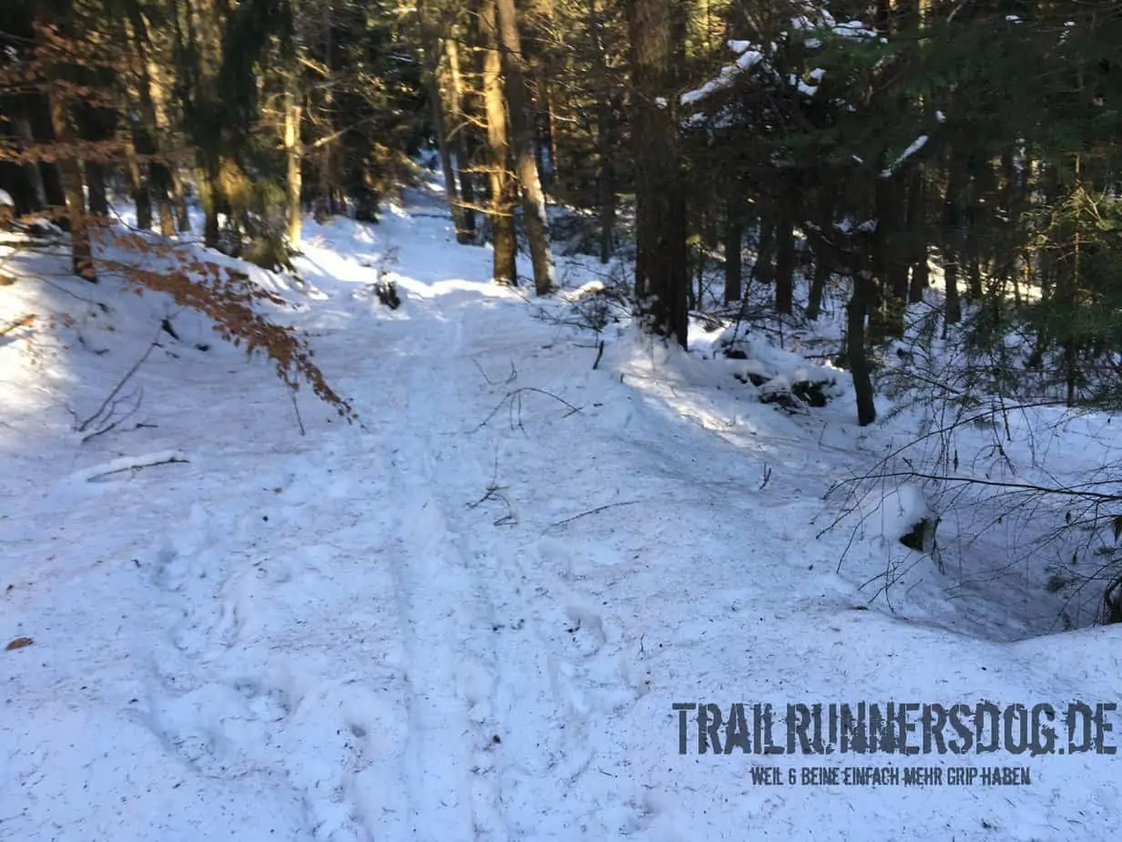 Die Strecke verlief größtenteils auf recht breiten Waldwegen, das scheint typisch für den E3 zu sein. Dank Schnee und Eis blieb es aber dennoch spannend und irgendwie war ich froh mich nicht über Singletrails schleppen zu müssen. Auf den Passagen wo es dann doch mal abseits der breiten Wege ging, war es entsprechend mühsam voran zu kommen. Es war also sehr abwechslungsreich und anspruchsvoll. Ein Winterultra eben.
