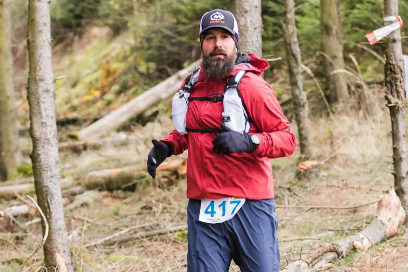 Die Temperaturen waren grade mal an die 10° und es war neblig und ungemütlich kühl. Absolutes Herbstwetter, wie zu erwarten. Zu Beginn konnten wir locker eintraben da es die ersten 5 km mehr oder weniger nur bergab ging. Der Steig führte uns über schmale Pfade durch den Wald und schon jetzt wurde klar dass Wurzeln und Steine unsere ständigen Begleiter werden sollten. Bei nassem Boden nicht immer leicht zu laufen und so blieb ich auf den ersten Kilometer gefühlt an jedem zweiten Stein hängen, stürzte aber zum Glück nicht. Vorbei an Simmerkopf (653m), Hölzerkopf (603m), Ödesborner Höhe (638m) ging es zum Ellerspring (657m). Mit seinen 657m sollte der Ellerspring auch der höchste Punkt an dem Tag sein, von nun an ging es quasi nur noch bergab. Ok, ok…nicht wirklich, allerdings liegt der Zielpunkt gute 440 Meter tiefer als der Ellerspring.