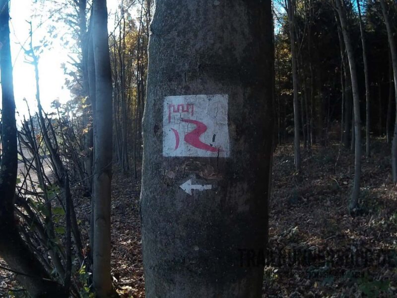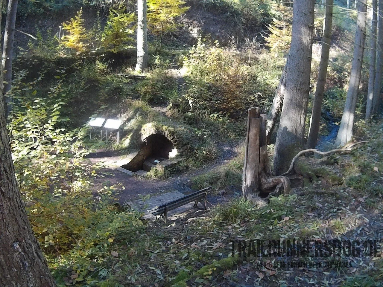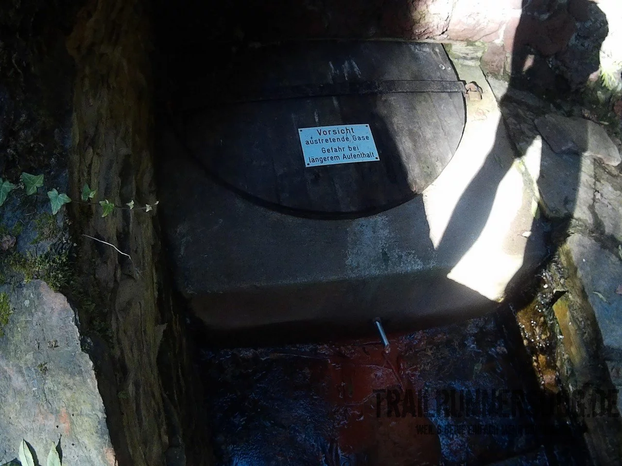 Im Wald unterhalb der Burg, befinden sich die Sauerbrunnen. Hier kann man ruhigen Gewissens seine Flaschen füllen. Die rote Farbe kommt vom hohen Eisengehalt, anderswo zahlt man dafür viel Geld. Hier läuft es einfach so aus dem Boden…