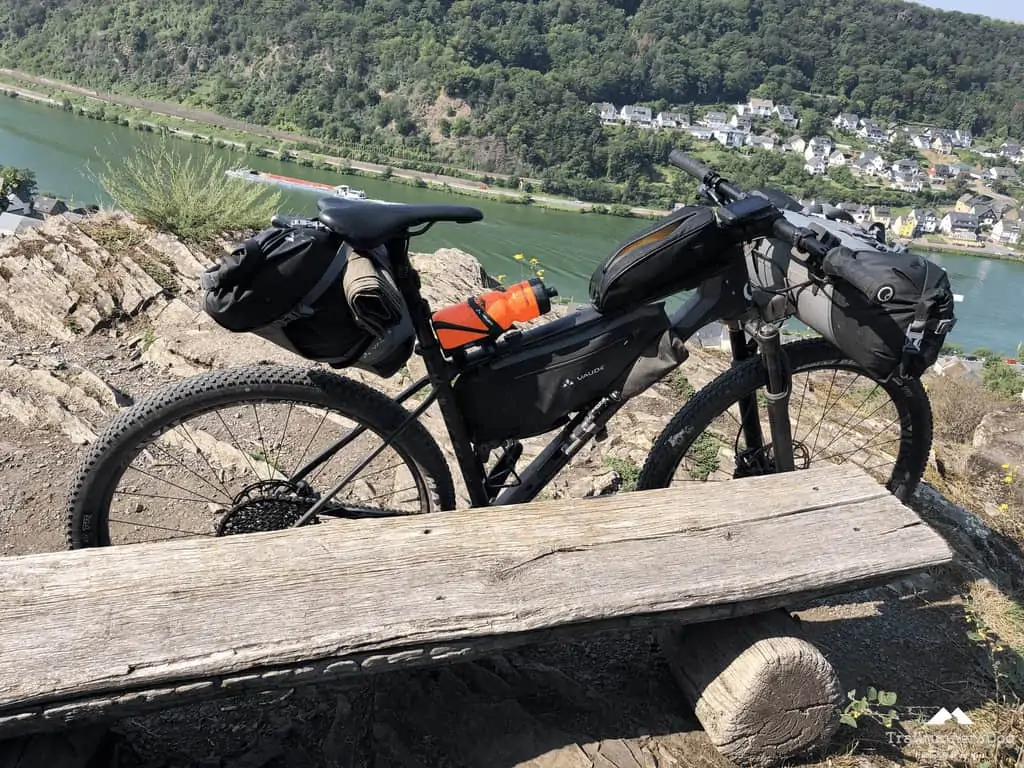 Ich rolle also von daheim los und drehe eine kurze Runde zur Niederburg um ein paar Kilometer mit der vollen Ausrüstung zu drehen. Puh…damit soll ich also im Schnitt 59 Kilometer am Tag auf dem Moselsteig fahren? Über Stock und Stein, Wurzeln und steile Anstiege hoch? Wenn ich mir vorstelle, dass für die Tour ja noch mehr Wasser und Verpflegung dazu kommen wird, dann fange ich jetzt schon an zu schwitzen.