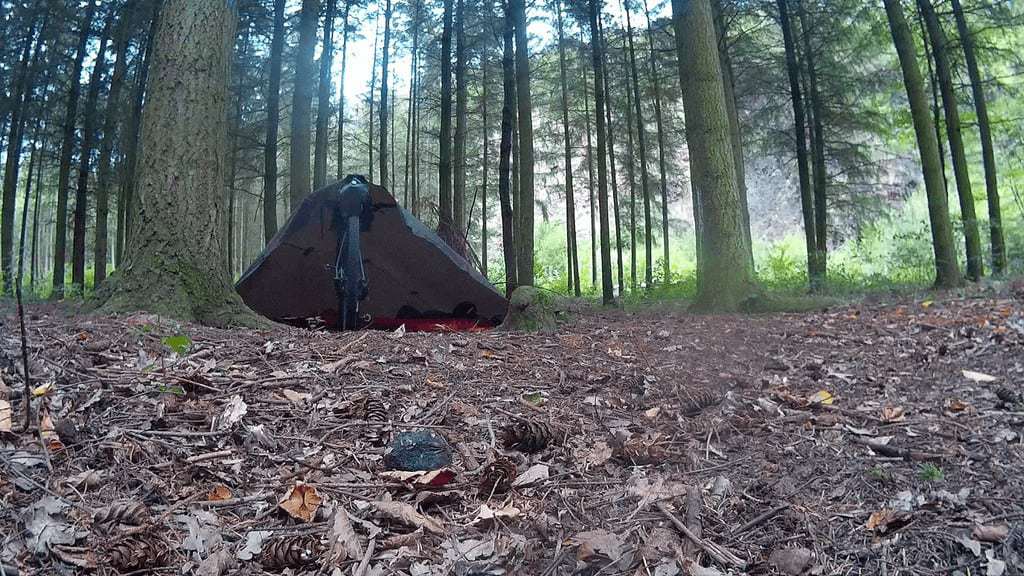 Die Tarpaufbauvariante mit Rad als Ankerpunkt wollte ich beim Overnighter unbedingt mal ausprobieren. Die hatte ich auf Youtube gesehen und fand sie fürs Bikepacking interessant. Das ich dabei kein Groundshield habe ist etwas doof…Ich habe da aber auch schon eine Idee wie ich ohne separate Unterlage auskommen könnte. Theoretisch sollte der Aufbau auch als Tortilla funktionieren, dann hätte ich einen Schutz von unten und könnte das Tarp trotzdem am Rad festmachen. Das Rad bekomme ich dann bei Regenwetter allerdings wohl nicht noch mit unters Tarp. Genau das ist ja der Vorteil meier hier gewählten Variante, ich glaube nämlich nicht, dass so gut fürs Rad ist wenn es die ganze Nacht im Regen steht und sämtliche Schmierstoffe abgewaschen werden. Da kann ich mich aber auch irren. Wenn das Rad unter Tarp steht oder als Ankerpunkt dient, klaut es außerdem auch keiner unbemerkt. Das waren so die Gedanken die mich zu der Aufbauvariante geführt haben.