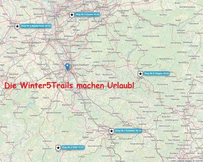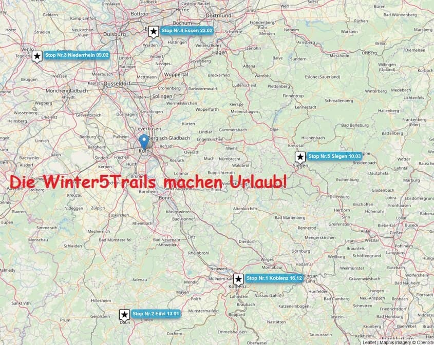 Bei den Winter5Trails treffen sich Freunde mit Freunden, um gemeinsam im Wald zu laufen. Vom Bergischen Land, dem Siegtal, dem Siebengebirge, der Ville bis in Richtung Eifel erkunden die Winter5Trails jedes Jahr rund um Köln gemeinsam Strecken von unterschiedlichen Guides.